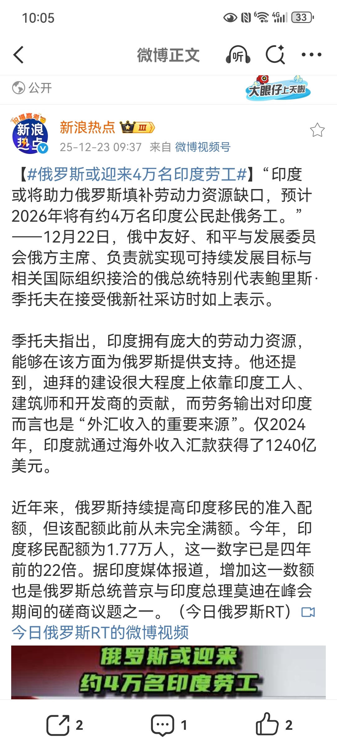 【俄罗斯或迎来4万名印度劳工】俄总统特别代表鲍里斯·季托夫12月22日表示,为填补劳动力缺口,预计2026年将有约4万名印度劳工赴俄务工。近年来俄持续提高印度移民配额,2024年已达1.77万人,是四年前的22倍。全网热点共创计划烽火问鼎计划俄罗斯青壮年除被源源不断送往乌克兰前线当“炮灰”,还有一部分因逃避兵役出国,导致国内劳工严重短缺,而人口大国印度正好可以填补这一空缺,印度庞大的年轻人口恰好能填补这一空白。这既是一种务实的经济安排,更是俄面对长期冲突进行“后方人力补充”的战略举措。长远看,因为俄男女性别比例失调,印度劳工大量涌入俄罗斯可能重塑俄人口结构,并带来深远的政治及社会影响(俄不希望华人来做这件事)。