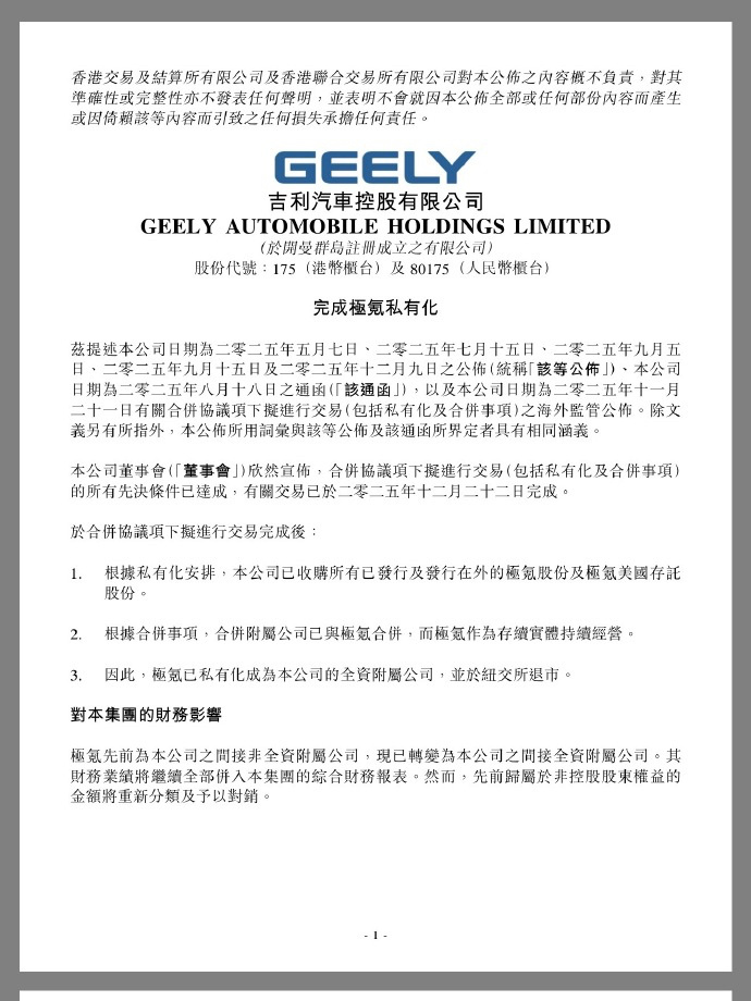 【吉利与极氪正式整合,极氪成为吉利全资子公司】吉利汽车在港交所公告:根据合并事项,合并附属公司已与极氪合并,而极氪作为存续实体持续经营。因此,极氪已私有化成为吉利的全资附属公司,并于纽交所退市。据悉,极氪先前为吉利的间接非全资附属公司,现已转变为吉利的间接全资附属公司。汽车极氪吉利汽车车圈新鲜事热点观察室汽车热点观察室