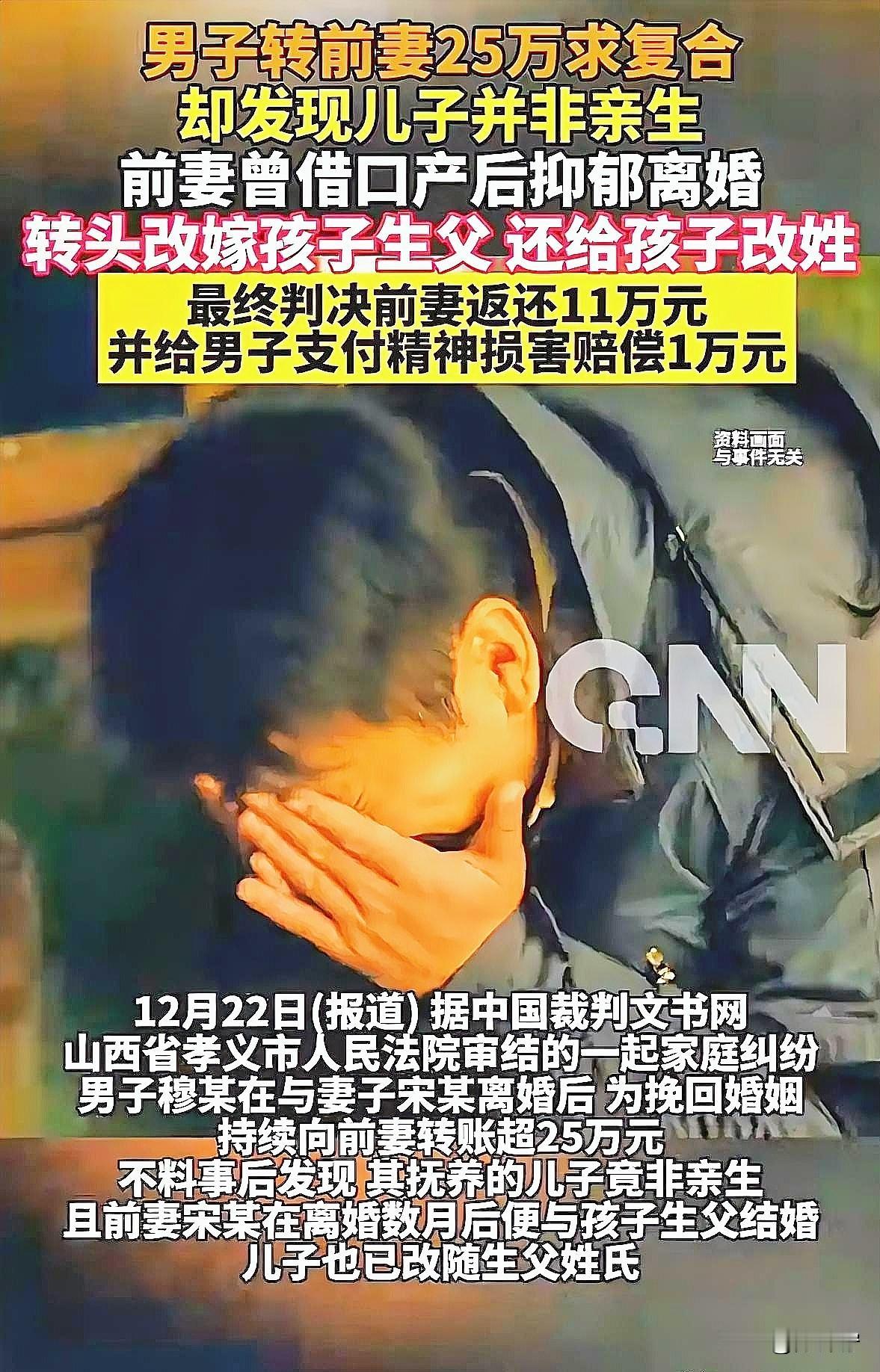 这大概就是“舔狗”的最高境界!2023年4月,前妻宋某拿“产后抑郁”当借口提离婚,穆大哥虽然舍不得,但还是依了她。 结果7个月后,宋某才坦白,孩子根本不是穆大哥的,还骗他说已经和孩子生父断了联系。 穆大哥也是个重情的人,一心想挽回婚姻,两年里前前后后给前妻转了25万,就盼着她能回头。 结果,偶然发现儿子医保卡改姓了,一查才知道,宋某早在坦白出轨的当月,就和孩子生父领证结婚了! 亲子鉴定也证实,孩子跟他半毛钱血缘都没有。 法院最终判决宋某返还11万元,并赔偿精神损失1万元。 只是穆某这两年的深情与期待,被辜负得彻彻底底,这种人财两空、真心错付的滋味,怕是只有经历过的人才懂。 出轨 生活 社会百态 感情