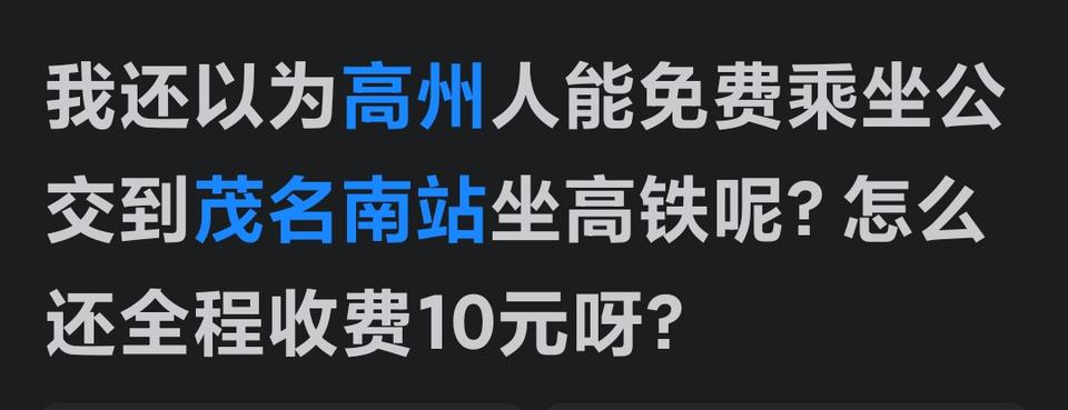 世上没有凭空掉馅饼的好事, 世上也不存在免费的午餐(寺庙免费素食除外)。 高州人前往茂名搭乘高铁,就别奢望能有免费的接驳公交可坐。 哪怕是东莞、深圳、广州、佛山这些富裕发达的城市,面对偏远地区的群众,也不敢承诺为市民提供免费接驳高铁站的公交服务! 坐免费公交,高州、化州、信宜人,就别把希望寄托在茂名身上了!