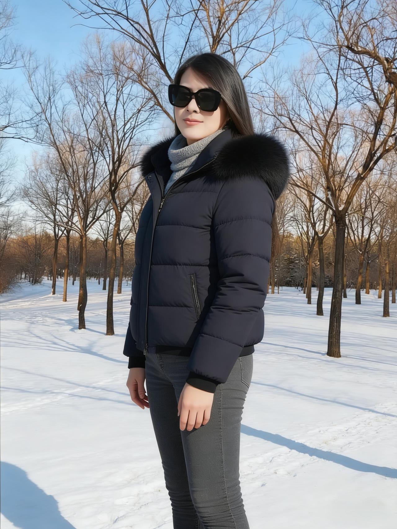 藏袄凌霜立雪林,毛领围寒映素心。 墨镜遮颜犹带静,一川风雪作知音。