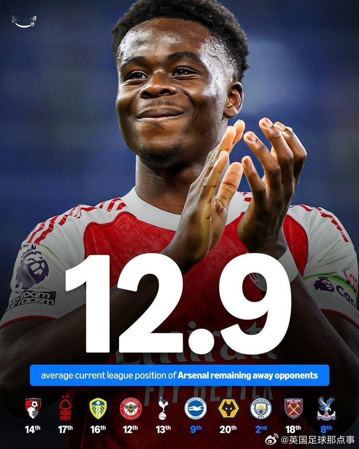 Prime:阿森纳本赛季剩余10个客场对手,平均排名12.9名,只有3个来自前十名。布莱顿(第9名)曼城(第2名)水晶宫(第8名)