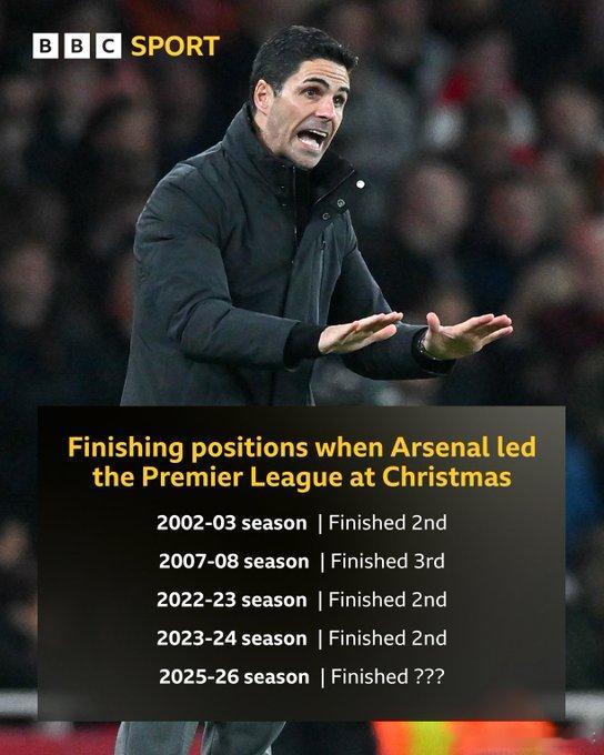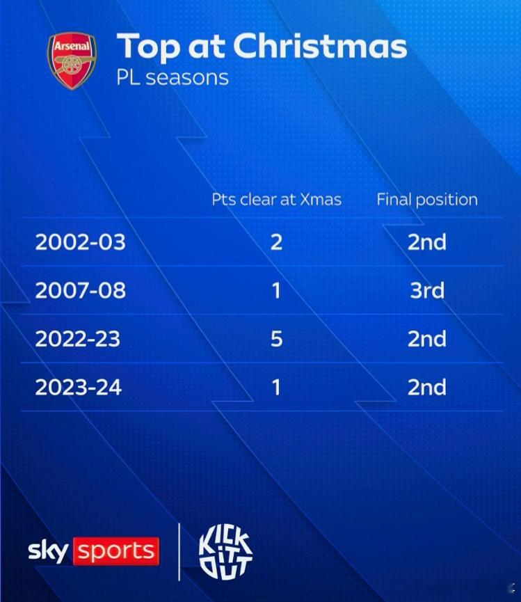 本赛季能破咒吗?阿森纳第5次获得英超“圣诞冠军”,但此前4次均无缘最终夺冠①2002-03赛季:亚军②2007-08赛季:季军③2022-23赛季:亚军④2023-24赛季:亚军⑤2025-26赛季:?