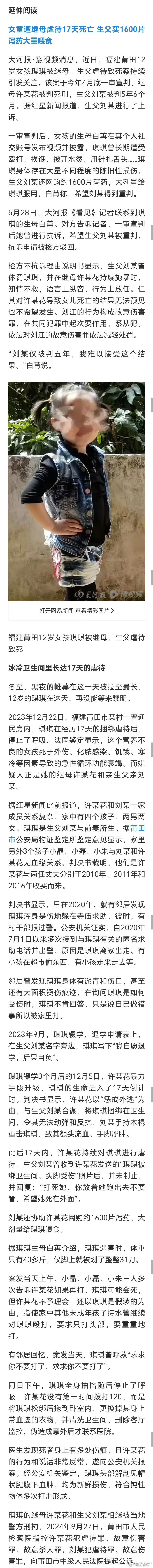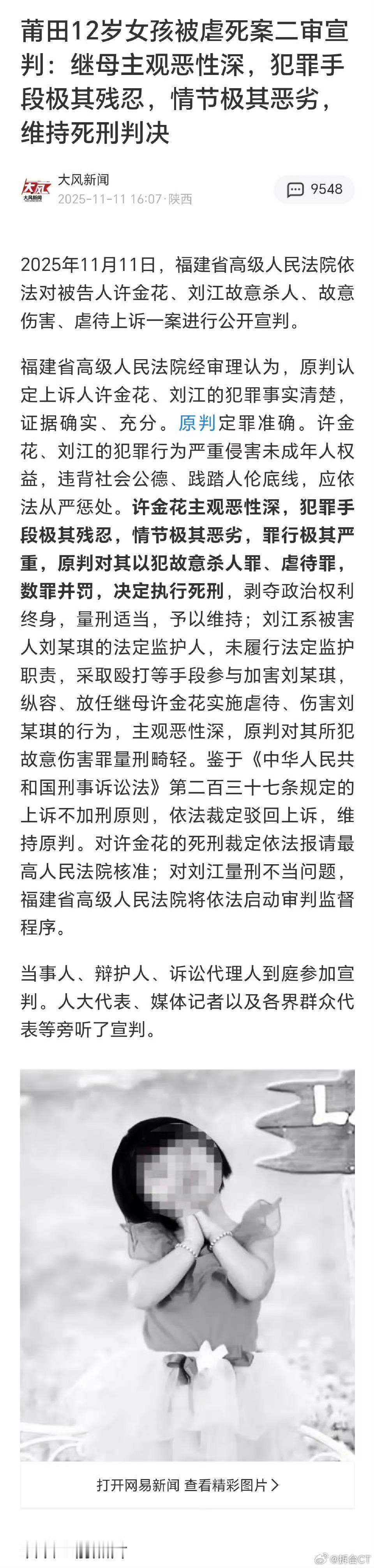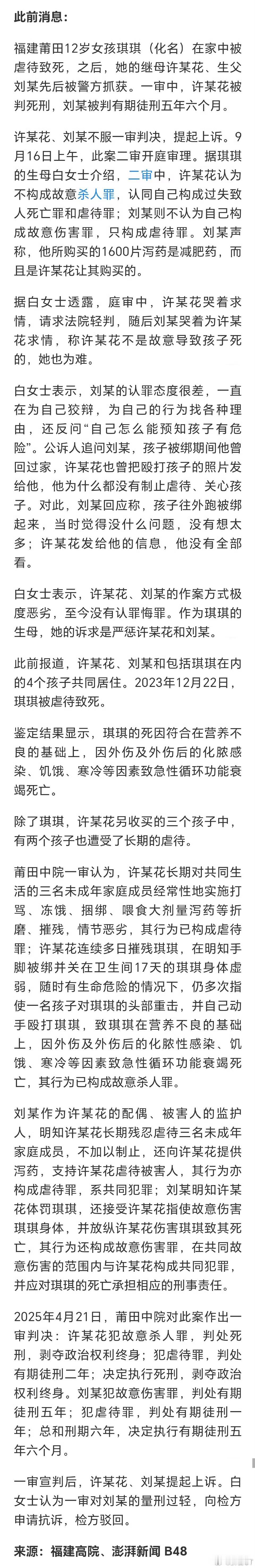 这是好事情啊。刚刚看到,12岁女孩被继母及生父虐待致死案再审宣判。生父刘江以故意伤害罪获刑13年,与虐待罪合并执行13年半。今年4月,莆田市中院对该案一审宣判。女孩继母许金花以故意杀人罪和虐待罪被判处死刑,女孩生父则以故意伤害罪和虐待罪被判处有期徒刑5年半。11月11日,福建省高院对该案进行宣判,维持对女孩继母许金花的死刑裁定,同时报请最高院核准;对女孩生父刘江量刑不当的问题,依法启动再审程序。👉相关报道见:网页链接实务案例看一看