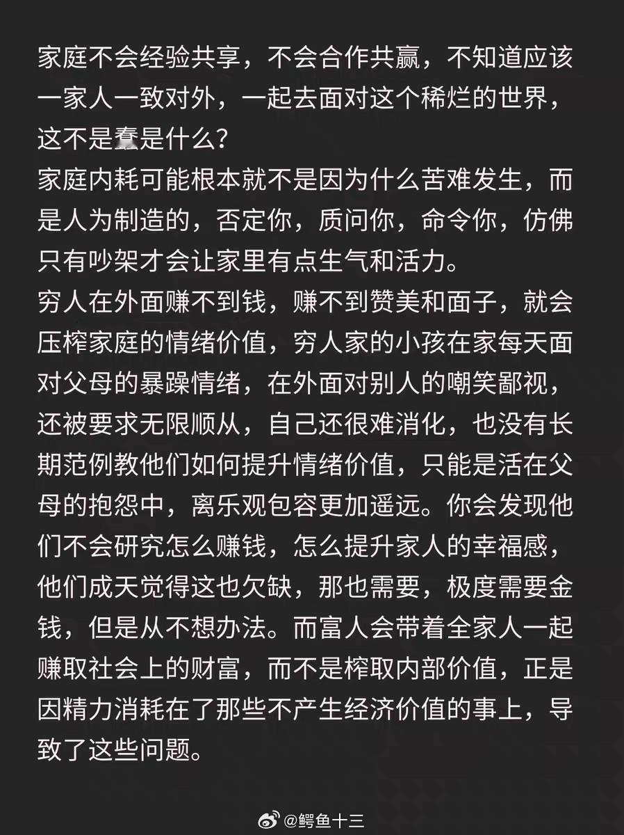 我妈眼里我的月薪三千好家庭环境,才是黄金啊!身边有没有遇到这样的人?生活中任何的小事,都能触发到他敏感的神经和自尊心,动不动甩脸摔筷子,一点小事就大发雷霆,上纲上线。这些其实都是向家人索取情绪价值,但这种索取是无穷无尽的,让全家都痛苦不堪,神经紧绷,也让孩子从小养成胆小懦弱的性格,长大后不扒掉几层皮是不可能醒悟的。