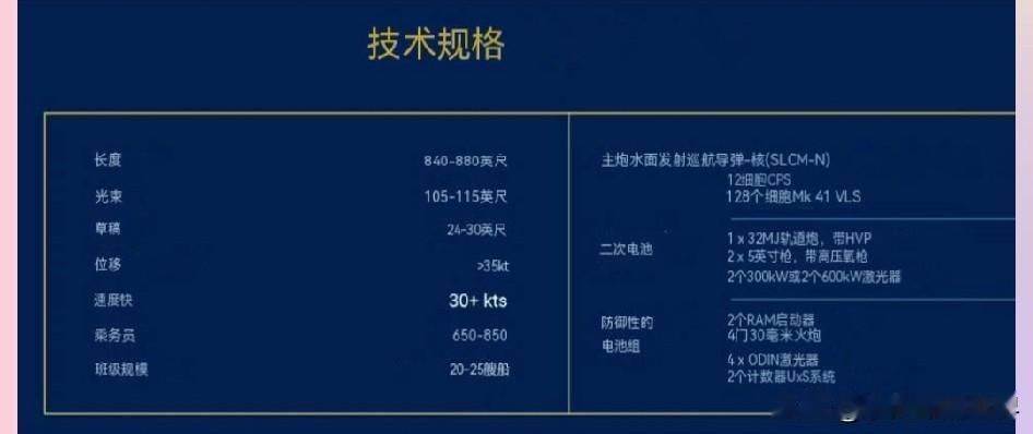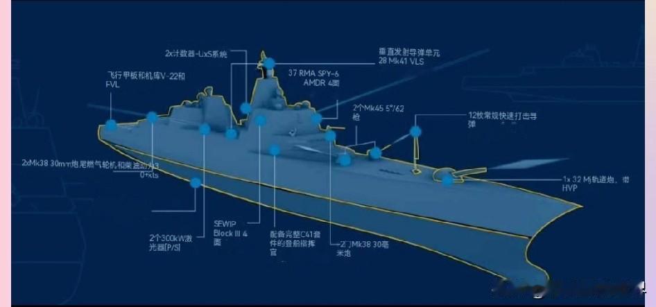 320毫米电磁炮、六部高能激光武器、2座127舰炮,却用着老掉牙的mk41垂发和半主动照射锅! 老美海军连画个梦想PPT都画不好,图为川普宣布的PPT导弹战列舰,实则就是伯克3扩大升级版而已。 除了高能激光器,电磁炮是新玩意外,其他的都是美国海军现有装备,都说是下一代战略舰了,雷达用的依旧是伯克3的37RMA-SPY6,此外头上还顶着3个祖传SPG-62半主动照射锅,就是不上X波段AESA雷达,美国海军这么恋旧啊? 垂发依旧是老掉牙的MK41垂发(128个)另外多加了12个CPS垂发上去(4个3联装垂发巡航导弹),问题是,这是一艘35,000吨排水量的巨舰,这么大的吨位就这点垂发! 唯一有亮点的就是舰上新增的6部激光武器,2部300-600kw级高能激光武器,4部30-50kw级近防激光器,以及一门320亳米电磁炮,这应该是这艘战列舰最大的看点。 其他2座海拉姆近防导弹,以及4座30毫米近防炮,2门127毫米舰炮,这都是老掉牙的装备了。 给我的感觉,这玩意就是主打一个气派,把一大堆东西都堆砌上去,实际上没啥新玩意。 高能激光武器,还有电磁炮,他连实物验证都没有,还想着上舰,做梦呢? 看看伯克三那个雷达,他造的都磕磕绊绊,下水两年多了,那艘伯克3还在等雷达。