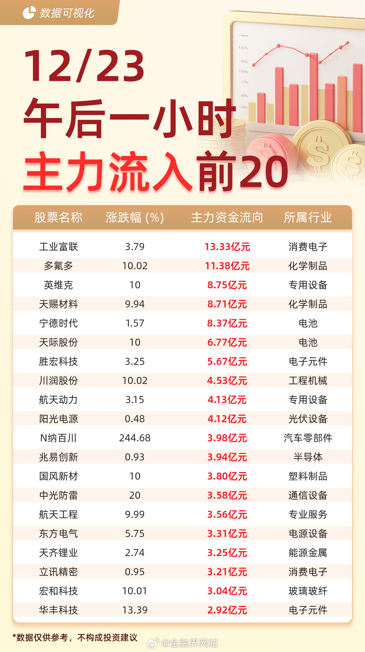 【主力资金流入前20:工业富联流入13.33亿元、多氟多流入11.38亿元】 据交易所数据显示,截至12月23日午后一小时,主力资金流入前20的股票分别为:工业富联(13.33亿元)、多氟多(11.38亿元)、英维克(8.75亿元)、天赐材料(8.71亿元)、宁德时代(8.37亿元)、天际股份(6.77亿元)、胜宏科技(5.67亿元)、川润股份(4.53亿元)、航天动力(4.13亿元)、阳光电源(4.12亿元)、N纳百川(3.98亿元)、兆易创新(3.94亿元)、国风新材(3.80亿元)、中光防雷(3.58亿元)、航天工程(3.56亿元)、东方电气(3.31亿元)、天齐锂业(3.25亿元)、立讯精密(3.21亿元)、宏和科技(3.04亿元)、华丰科技(2.92亿元)。详情:网页链接