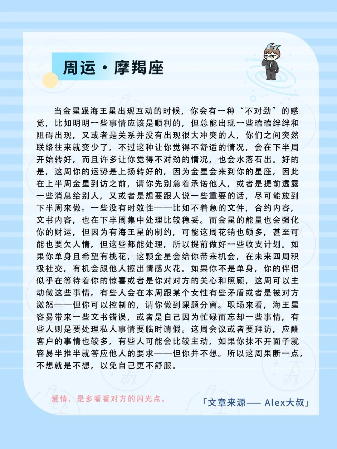 金星跟海王星会带来迷惑,迷茫,不安,或者是脱离现实,但是——这周金星会来到土象星座,恰好会消解所谓的迷惑,迷茫和不安,因为会从虚幻走向真实、现实,上述提及到的一些问题,可能在本周很快就有实际的结果和答案出现,但是肯定会有很多人依旧存疑甚至是不相信。