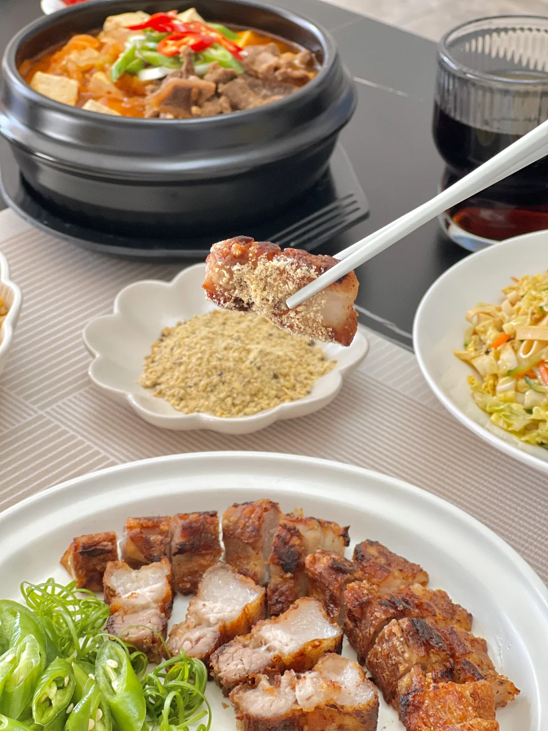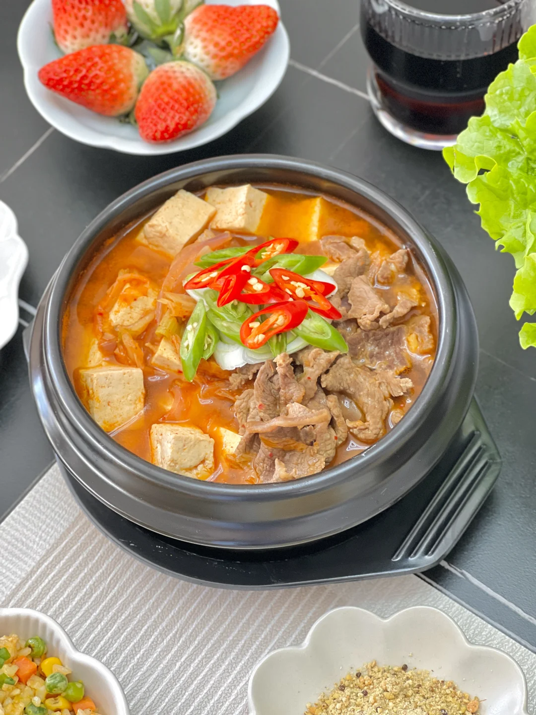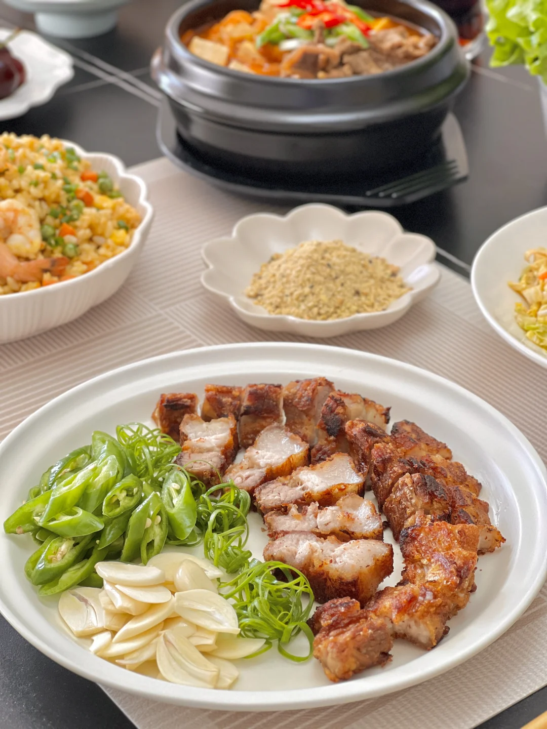 暖呼呼的辣牛肉汤来啦~这种辣辣的,里面有泡菜的汤是我的心头爱,天冷了一碗下去很舒服~还有咬起来脆香的脆皮五花肉,肥肉的油都被煎出来了,一口下去,满是肉的焦香味,配上蒜吃香迷糊啦[派对R] 【水煎五花肉】 【辣牛肉汤】 【耳光炒饭】 【白菜心拌豆腐丝】