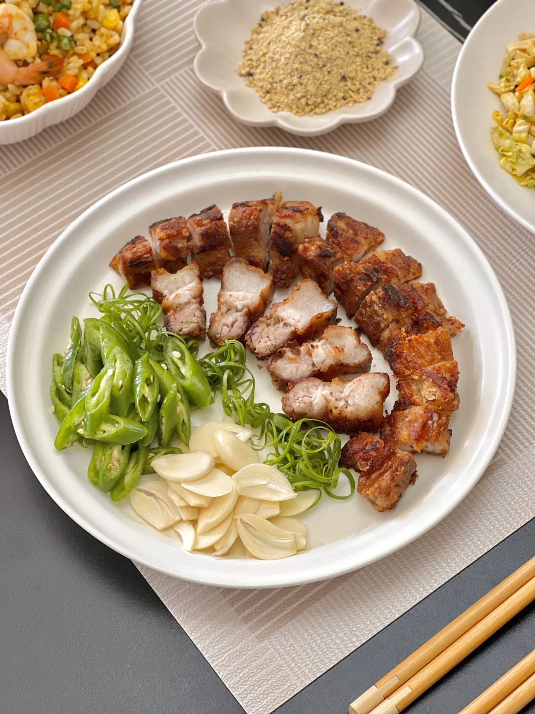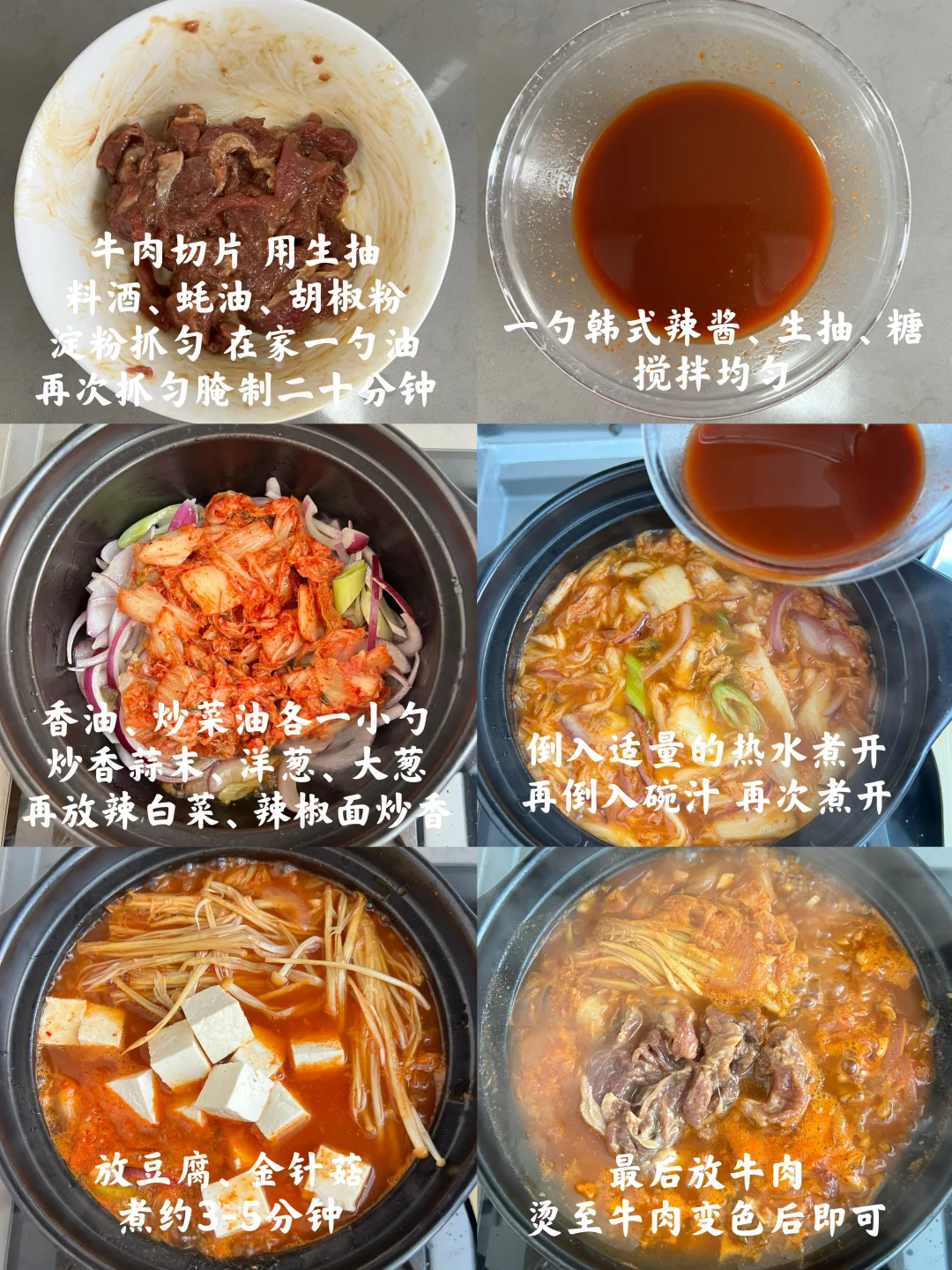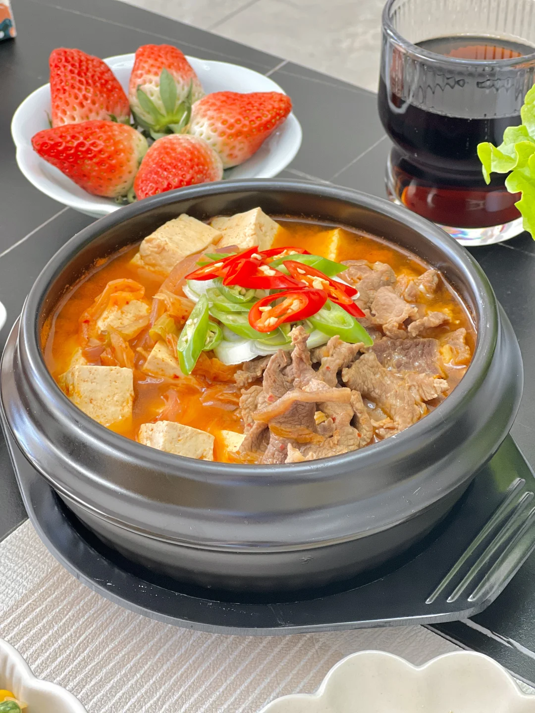 暖呼呼的辣牛肉汤来啦~这种辣辣的,里面有泡菜的汤是我的心头爱,天冷了一碗下去很舒服~还有咬起来脆香的脆皮五花肉,肥肉的油都被煎出来了,一口下去,满是肉的焦香味,配上蒜吃香迷糊啦[派对R] 【水煎五花肉】 【辣牛肉汤】 【耳光炒饭】 【白菜心拌豆腐丝】