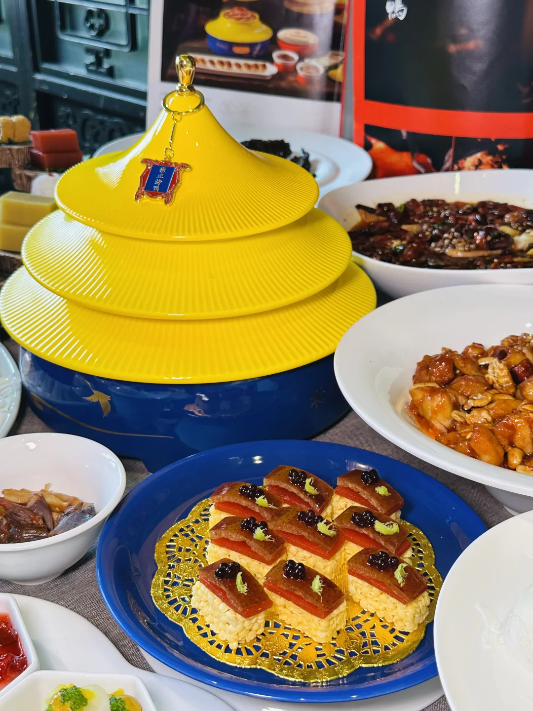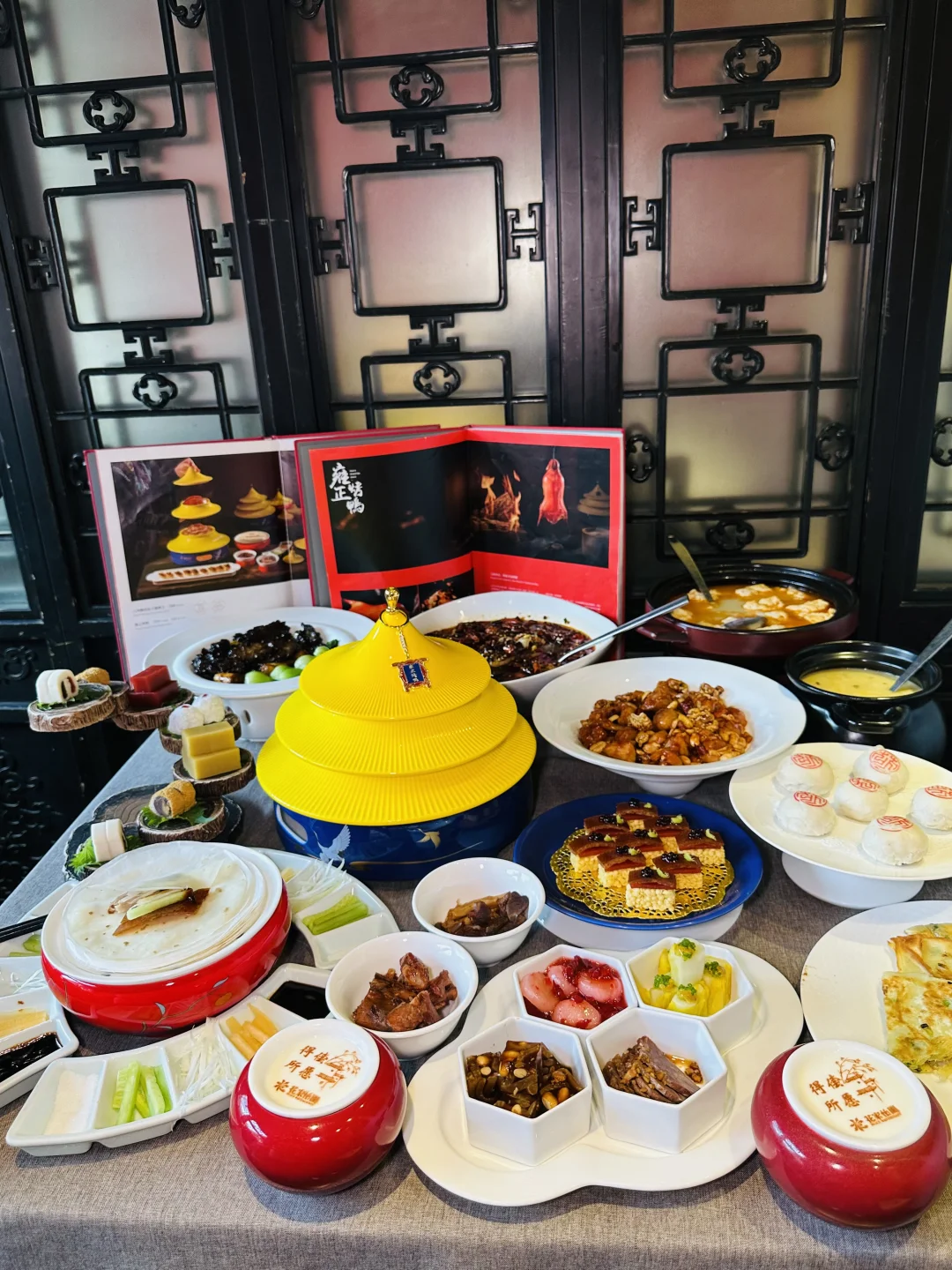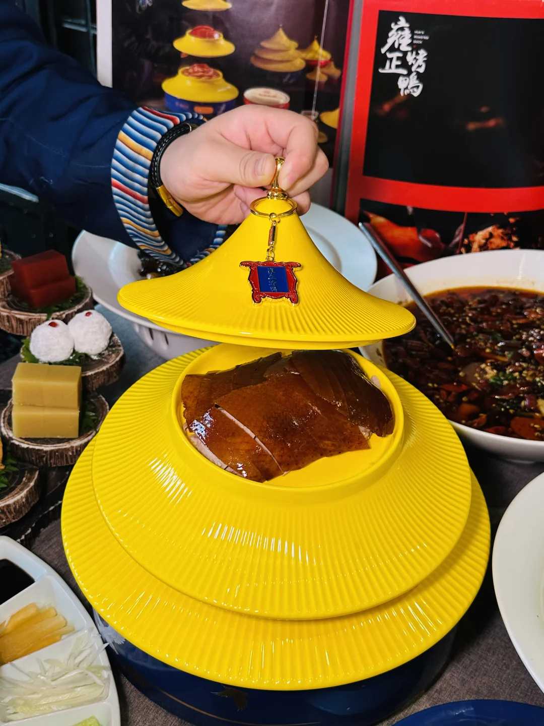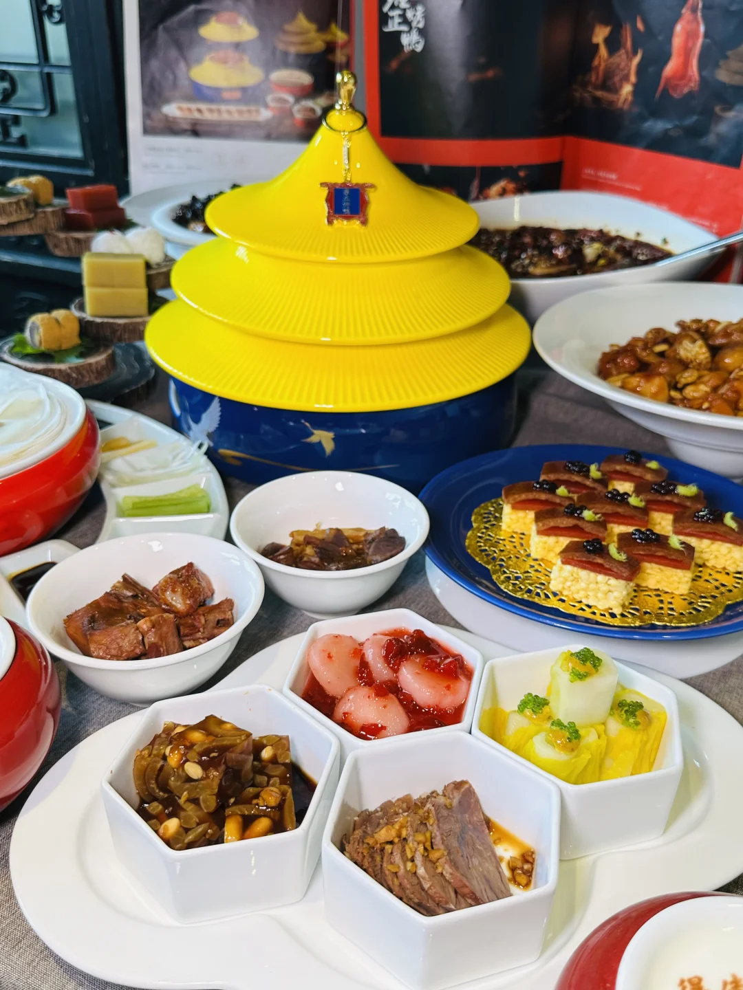 ✅雍正烤鸭:精致的盘子是天坛祈年殿造型,仪式感满满,鸭皮酥到掉渣,裹着荷叶饼配葱丝甜面酱,一口下去油脂香和面皮的软糯融合得刚刚好,不愧是京菜天花板级别的烤鸭
