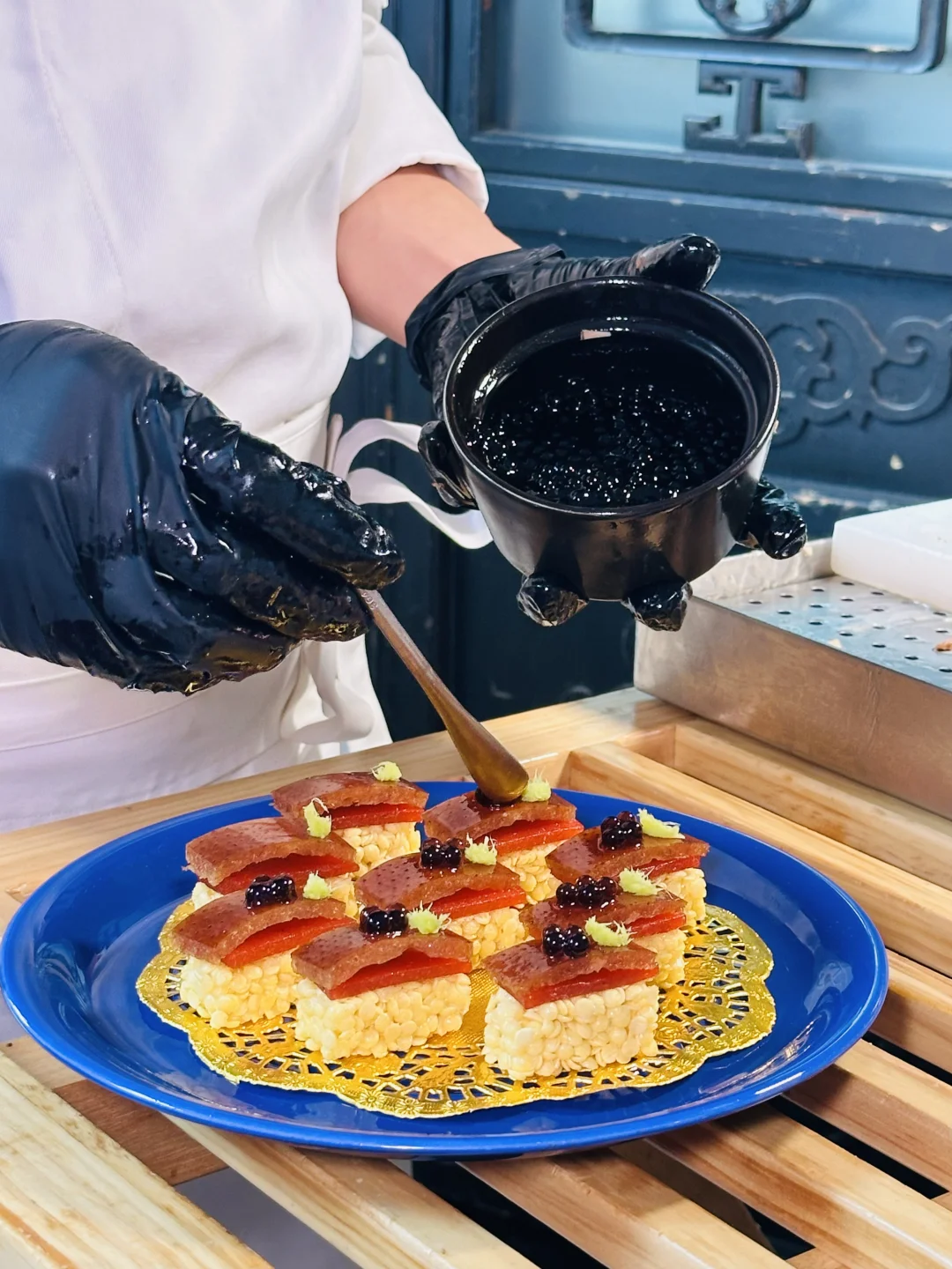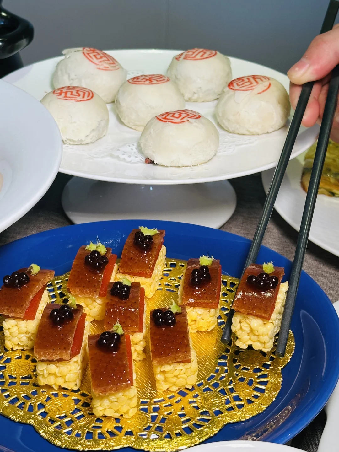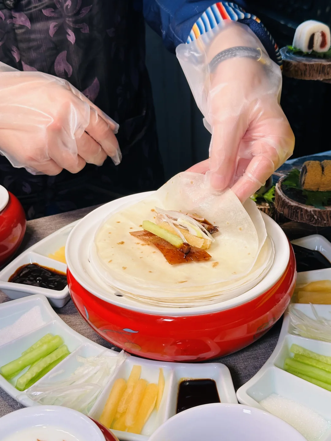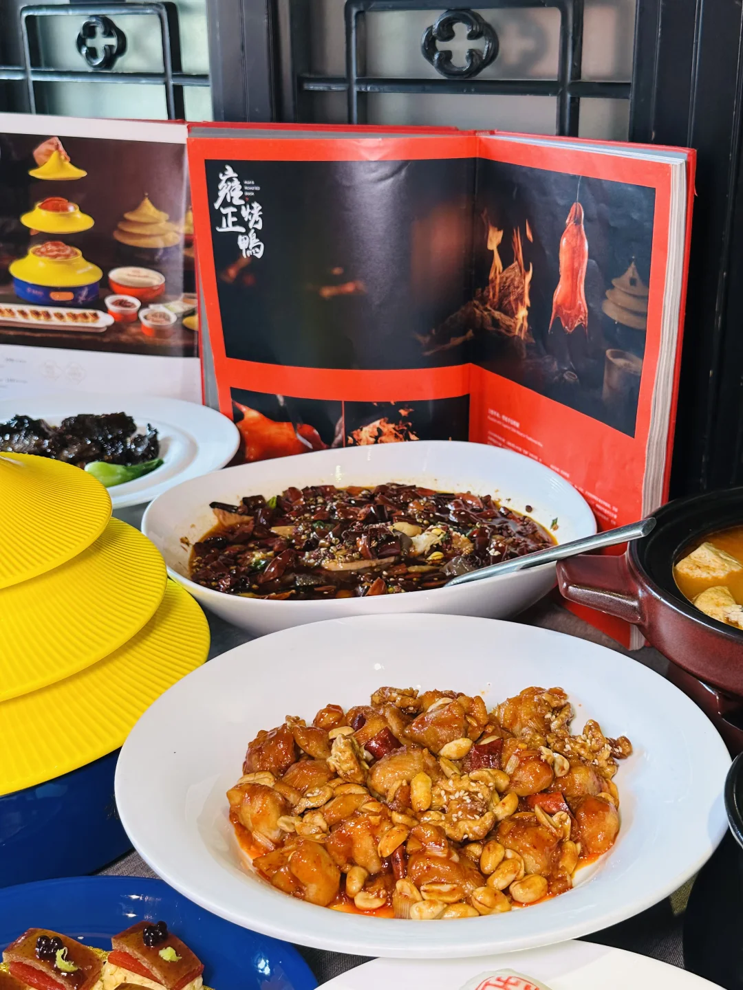 ✅雍正烤鸭:精致的盘子是天坛祈年殿造型,仪式感满满,鸭皮酥到掉渣,裹着荷叶饼配葱丝甜面酱,一口下去油脂香和面皮的软糯融合得刚刚好,不愧是京菜天花板级别的烤鸭
