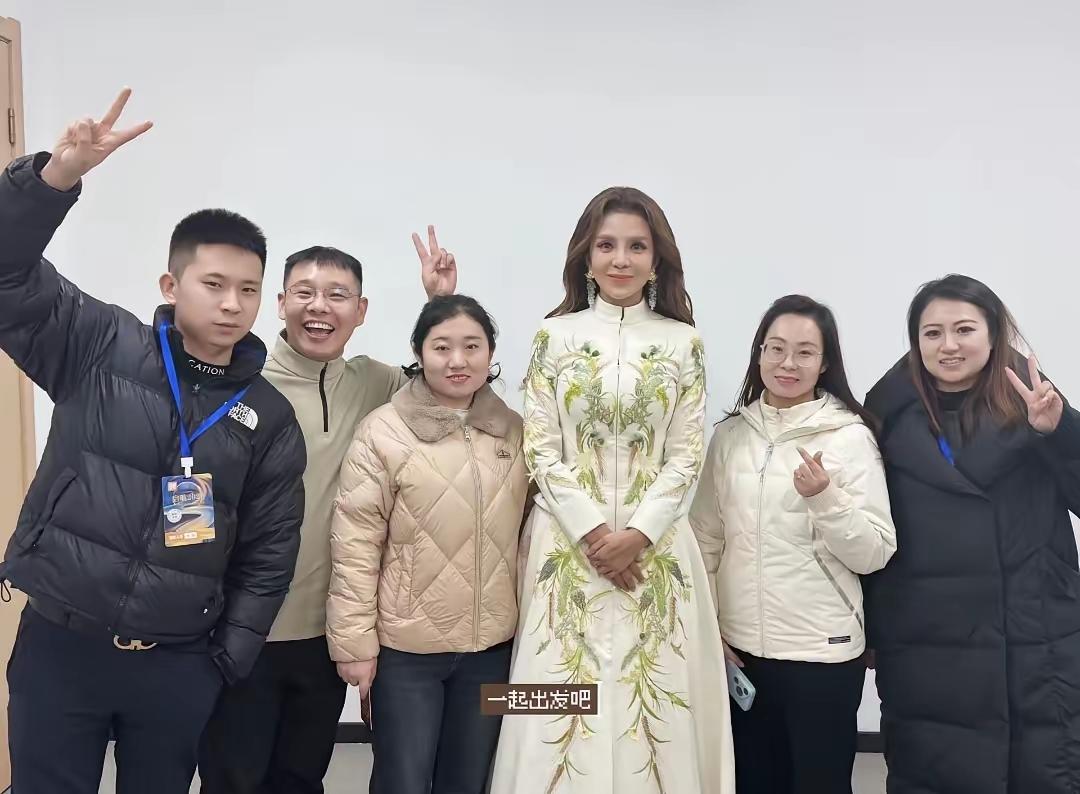 朱迅惊喜空降山西主持节目,一袭白绿印花拖地长裙美得让人挪不开眼,妥妥的主持界时尚标杆! 裙摆曳地自带强大气场,同色系浅绿色吊坠点缀其间,更添几分温婉气质,一头染过的长发披肩,整个人光彩照人。合影环节中,身姿高挑的她与工作人员同框,亲和力直接拉满。