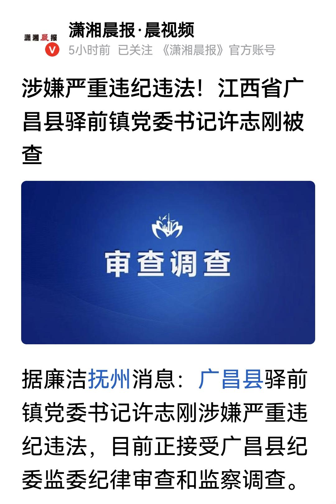 江西广昌的许志刚,今天彻底栽了。 这个许志刚也不简单,网上关于他的公开资料很少,出生年月不详,但是从官网发布的照片来看,年龄大概在40岁左右。 他拥有大学学历,曾经在广昌县多个乡镇工作。 此前担任过广昌县杨溪乡党委副书记、乡长。 于2019年4月,正式晋升为杨溪乡党委书记。 于2021年5月,担任广昌县驿前镇党委书记。 很多人说乡镇一把手,其实也没多大的实权。 其实不然,很多的乡镇一把手,在当地也是实权人物。 许志刚属于任上落马,因为就在今年的5月30日,广昌县委常委、副县长李寿孙率队在江西美景科技集团调研,并且召开了座谈会。驿前镇党委书记许志刚等人陪同调研。 也就是说,距离最后一次公开露面,经过半年之久,许志刚便迎来了属于自己的“翻车”时刻,可谓是: 身处基层应勤勉,若是萌生贪腐意。 心怀侥幸逃一劫,审判剑落断终生。