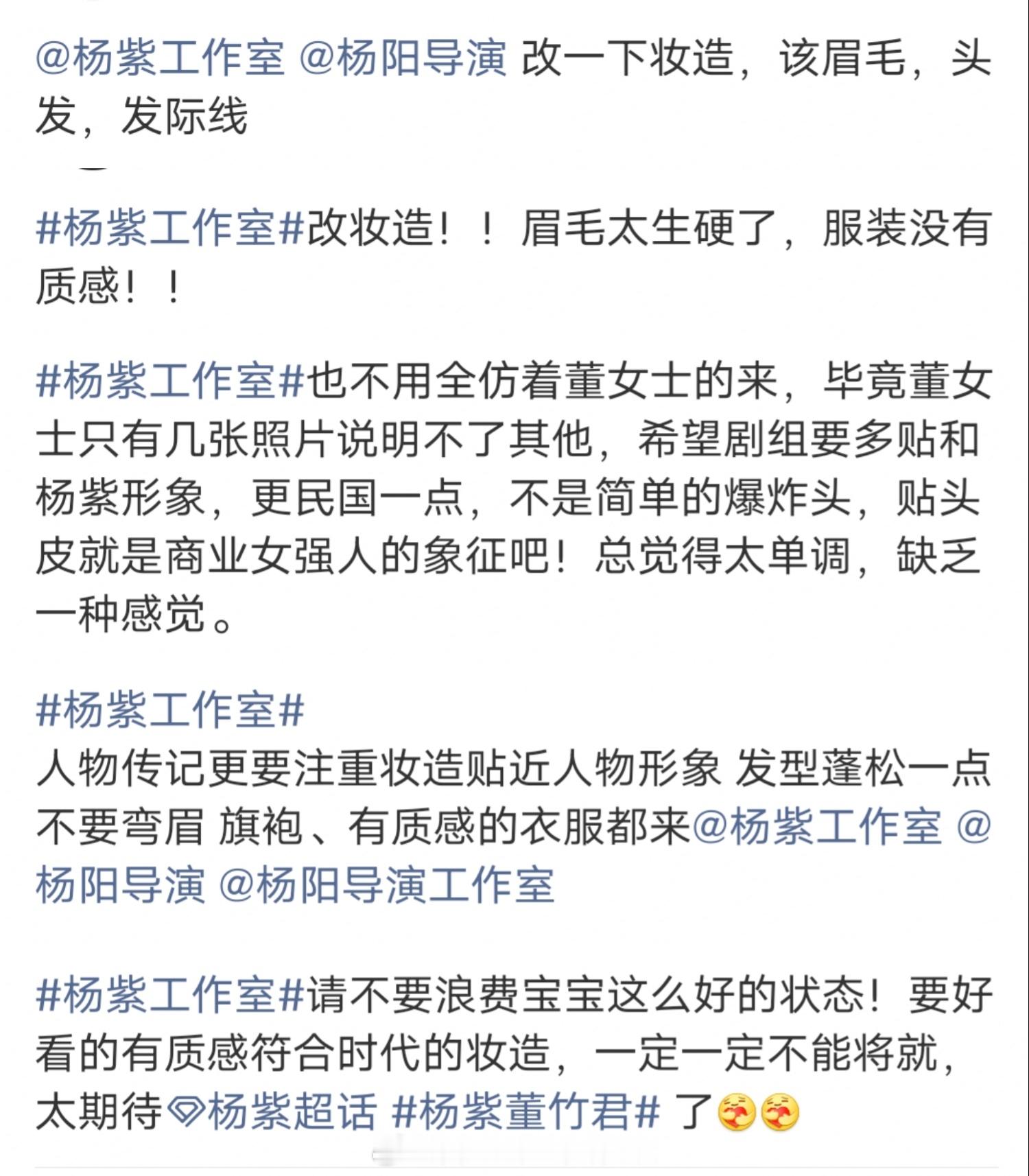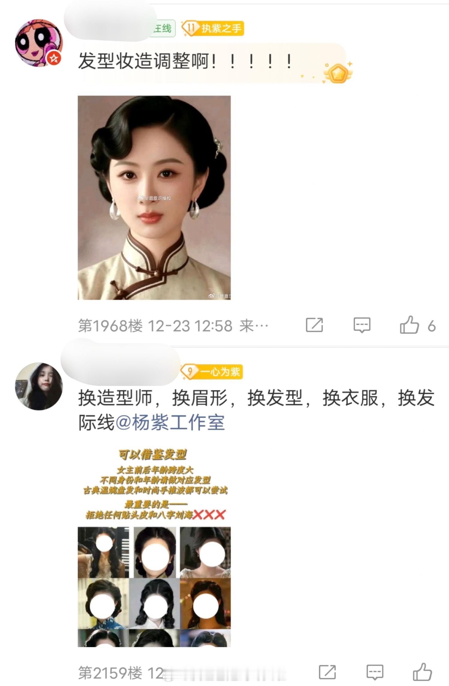 杨紫工作室评论区,粉丝都希望新剧能调整一下发型妆造,要好看的、有质感的、且符合时代的妆造。换掉又弯又粗的眉毛,眼妆唇妆加深,不要全漏额头,不要贴头皮发型尽量蓬松一点,再多来点旗袍和有质感的服装。杨紫工作室 杨紫青衣饼一个接一个拿杨紫欧豪官宣开机海报