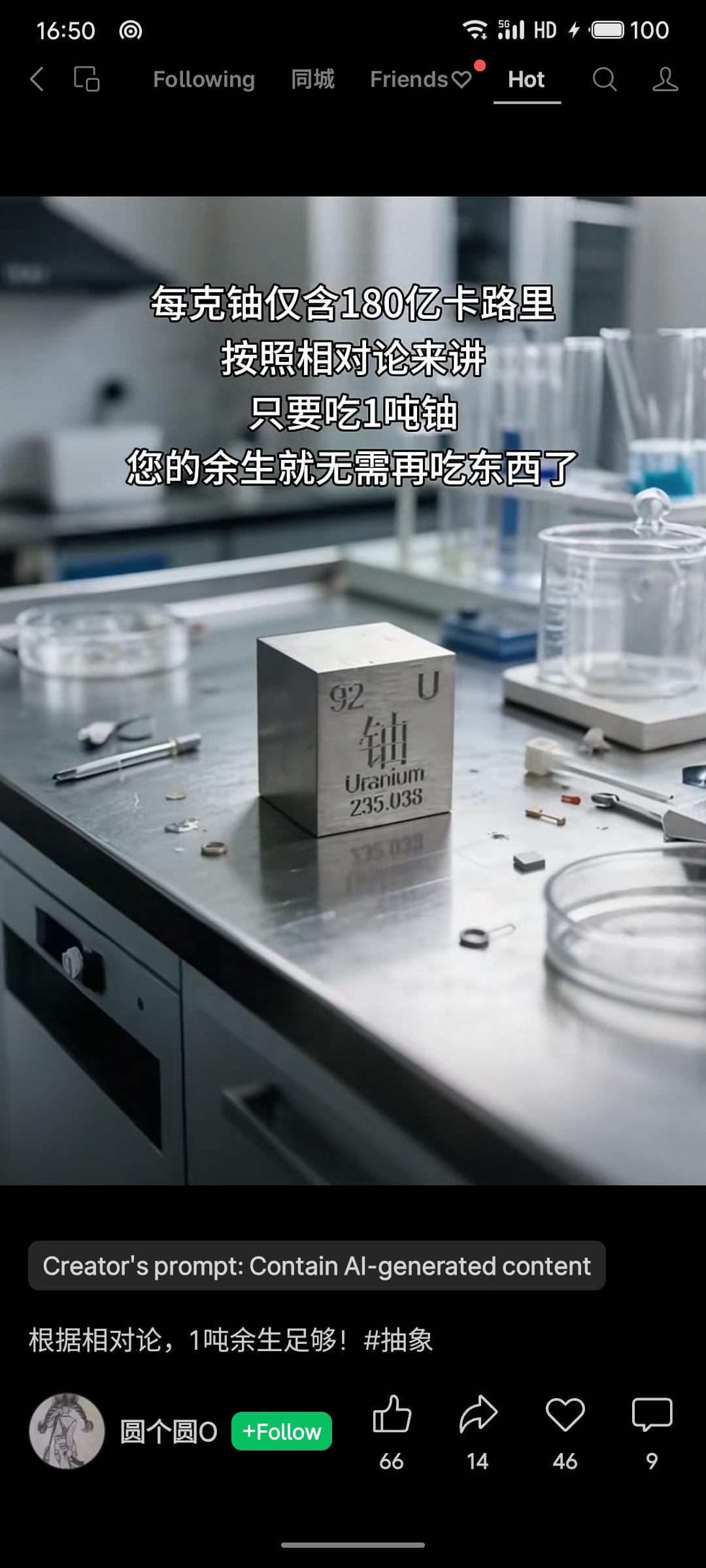 展示了一条网络幽默段子,其用“180亿卡路里/克”和相对论E=mc²等科学概念进行戏仿,推导出“吃1吨即可余生免食”的荒谬结论,属于典型的抽象搞笑风格。