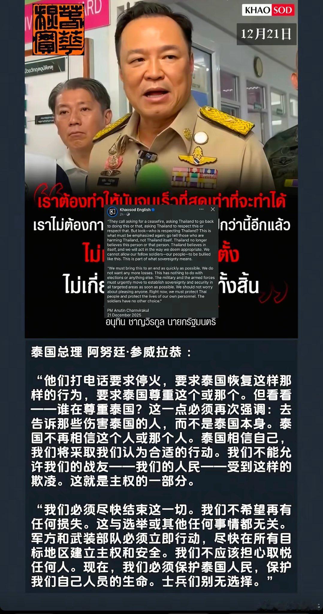 洪森真是活该! 早知阿努廷这么强硬,他何必为难佩通坦一小姑娘? 以为拿捏了软杮子,结果踢到了榴莲壳。新上任这位泰版“西装暴徒”阿努廷,直接让柬埔寨懂了什么叫“后悔药没处买”——不谈、不退、不停火,F-16骑脸输出,谁劝都不好使,连特朗普打电话都被怼回去,大有一副“未经他人苦,莫劝他人善”的架势。 更绝的是,连中国网友都一边倒给泰国刷火箭。能把“老铁”逼成“对家”,这洪家可太能耐了! Source: Weibo