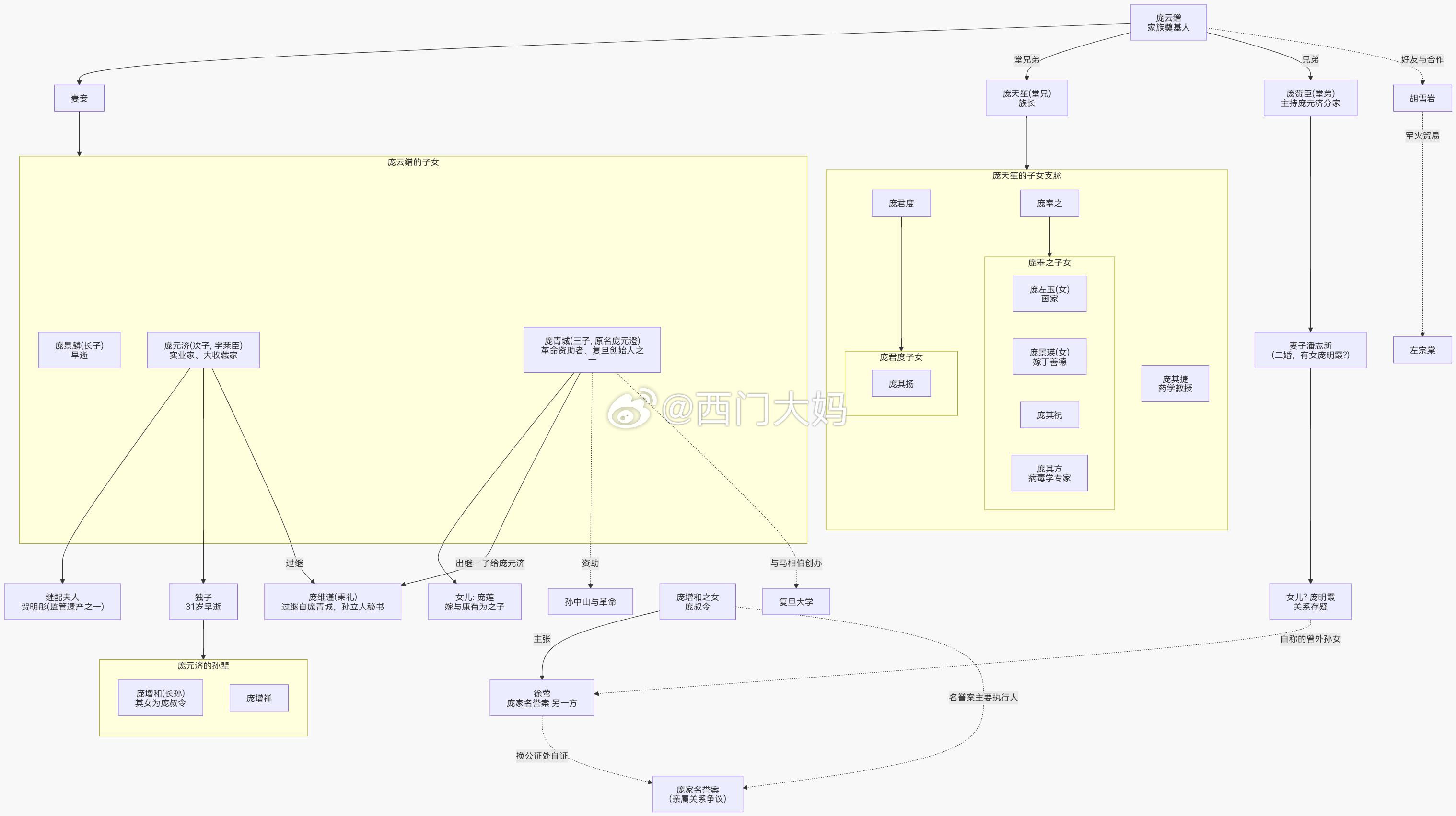 这次闹出大事的庞家,曾经是南浔赫赫有名的 “四象”。所谓 “四象” 就是当地最有钱的四户人家。大家千万别觉得,南浔也不是大城市,最有钱的人家无非就是土豪,撑死了就跟今天浙江上市公司老总一样。在当时,能入围 “四象” 的硬性条件是家产在千万两白银以上。这是什么概念呢?如果我们用米价和房价大致折衷一下,可以计算出 1 两白银 = 200 元,当然这是比较保守的算法,绝大部分时候银子是比这个贵的,所以你算算千万是什么概念...南浔 “四象” 分别是刘、张、庞、顾,就是这个排名,这四家各有特色,当时大家有 “刘家的银子,张家的才子,庞家的面子,顾家的房子” 之说。除了 “四象”,还有八牛(500-1000 万)、七十二金黄狗(100-500 万)....但是就这么牛逼的家族,其实发家史很近。这事要从庞元济的父亲庞云鏳说起,他年轻的时候是个小学徒,在丝行学做生意,后来自己开了 “庞怡泰行” 做买卖,经常跑上海,甚至还做起了外贸,倒腾了几把外汇。后来他在上海做生意的时候,听说父亲去世,就赶紧回去奔丧,然而此时南浔已经被太平军占领了,太平军就跟他谈,想要让他通过湖丝生意去上海帮忙买军火。当然了,作为回报,太平军会发给他特许经营权,约等于答应给他印钞机。太平军找庞云鏳是有理由的,因为他有个很有门路、能买来各种军火的好朋友,名叫胡雪岩。然而看到这儿大家也能想到,既然庞云鏳和胡雪岩是朋友,那当时正在和太平军打仗的左宗棠....更重要的是,万一太平军战败了(不得不说考虑的很对)....庞云鏳左思右想,觉得这特么太难了!!!杀了我吧!!要不,跑?这是普通人的想法,人家庞云鏳不是一般人。他的选择是:我是生意人,不是政治家。你们不是都要军火吗?谁出钱!我就卖给谁!我不管你是左宗棠还是太平军,反正我只认钱!太平军失败后,左宗棠对他倒也没有为难,反而继续倚重他买军火打仗,所以大家也能想到他家财富那是滚雪球一样积累起来了。有了钱之后,庞云鏳也开始做慈善回馈社会,穷苦人得了病没钱,只需要去他家账房要个凭据,然后就可以去药店拿药,完全不要钱。除了在家乡南浔修桥补路,舍米舍钱,他甚至还在杭州修缮了下河塘塘堤和拱宸桥。最牛逼的是,他在多年好友胡雪岩疯狂孤注一掷高价囤积生丝的时候,凭借惊人的风险嗅觉和政治判断力,认为胡雪岩和李鸿章派系要开干,自己赶紧跑路,避免了和胡雪岩一样的结局,保住了巨额财富。庞云鏳的原配夫人施氏出身南浔地方富户,也是做丝行的,和庞家当时应该算门当户对。只可惜施夫人没享到福就早逝了。庞云鏳后来又娶妻纳妾,一共生了三个儿子。老大庞景麟早逝,老二便是鼎鼎有名的收藏家庞元济,字莱臣,也继承了他的大部分家产,名下的实业名字一张 A4 纸五号字正反面都写不完。而三子庞元澄,字清臣,后来他改为了 “青城”。为啥呢?因为他要去反清!当年他爹庞云鏳给清廷捐了 10 万两白银,慈禧很高兴,就赏赐他的儿子们每人一个官职,但是庞青城坚决拒绝,然后就改了 “字”,表示不当清朝的臣子。然后他干啥了呢?当然是去参加同盟会,给孙大炮氪金啦!本来庞青城一个南浔人,根本不认识广东佬,但是他有个姐姐,嫁给了南浔门当户对的张家,生了个儿子,名叫张静江。就这样庞青城通过外甥,认识了孙中山,然后开始给革命疯狂刷大火箭。只不过吧,他本人其实没有什么政治抱负,就纯粹是为了搞事情,或者为了哥们义气加入的同盟会。民国建立后,他啥公职都没担任,就在上海当寓公,和哥哥一样研究各种古董,尤其喜欢书画碑帖和奇石。不过除此以外,他还和朋友马相伯一起干了一件在当时看起来不太大的事情:创立了复旦大学,具体地说就是:氪金!庞青城 1945 年才去世,他的女儿庞莲后来嫁给了康有为的儿子。庞元济的子女运不太好,他仅生了一子,其子 31 岁便早逝了,丢下庞增和、庞增祥两个孙子。庞元济后来又过继了弟弟庞青城的一个儿子庞维谨(秉礼),也就是后来孙立人的秘书。庞元济八十多的时候,觉得身体不行,要早立遗嘱,于是他将自己毕生收藏的藏品分为三份,嗣子和两个孙子一人一份。只不过后来执行的时候,实际上是分为了四份,除了每个人一份之外,还有一份算是共有的,由继配夫人贺明彤监管。1949 年 3 月庞元济去世后,他的堂弟庞赞臣主持分家析产。庞赞臣是庞云鏳兄弟之子,比庞元济小 17 岁,一直协助庞元济管理家族产业。所以庞元济去世后,他作为当时族内长辈,来主持分家大家都心服口服。但可能是这次分遗产闹得(这么大遗产怎么可能不闹),两家后来几乎没有任何往来,庞家这么爱记录的人家,在此之后,就没有出现任何和庞赞臣有关的记录,包括但不限于家族聚会、书信往来或共同事务参与。庞元济继配夫人贺明彤晚年回忆中,几乎未提及庞赞臣及其后代。别说当年,就是现在,这样的堂亲也不多见,应该是有很大矛盾。而这次庞家名誉案的主要执行人,便是庞元济嫡亲长孙庞增和的女儿庞叔令。徐莺自称的身份,是庞赞臣的外曾孙女,也就是庞赞臣的女儿的孙女。然而庞赞臣的妻子潘志新是二婚,而庞赞臣自己亲口承认自己无儿无女,因此庞叔令和父亲主张,潘志新的女儿庞明霞无法证明是庞赞臣的女儿,仅仅是潘志新。杭州市公证处接受了这个说法,撤回了之前出具的徐莺和庞赞臣的亲属关系公证。当然徐莺很快换了个公证处又做了一份....大家