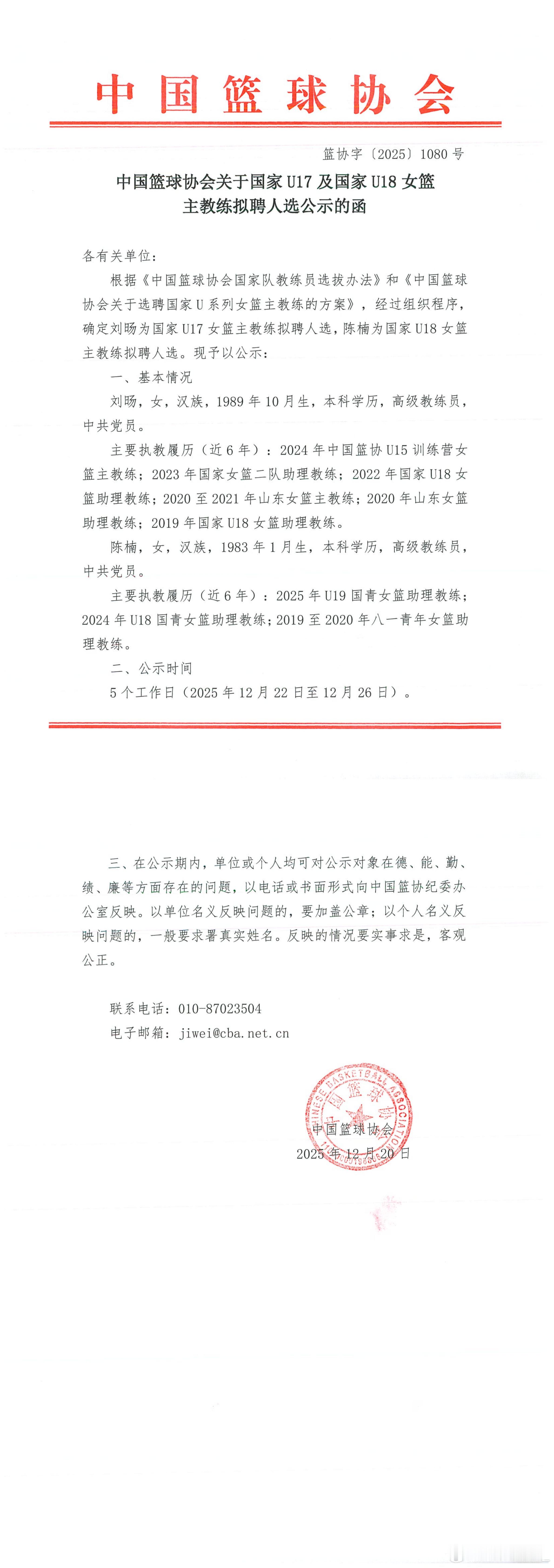 【两支国字号队伍主帅出炉 陈楠执掌U18女篮教鞭】中国篮协发布公告,公示国家U17及国家U18女篮主教练的拟聘人选。如公示无异议,陈楠将成为U18女篮国家队的新任主帅,刘旸将在U17女篮国家队中挂帅。 陈楠“转正”并不意外,她是国青女篮过去两年征战世界大赛(U18亚洲杯、U19世界杯)的助理教练,帮助张子宇实力提升。U18女篮国家队的阶段性比赛任务是明年的U18女篮亚洲杯,篮协为队伍设置的成绩目标是前三名。 过去几年,刘旸的名字相对较少被提及,2023年,她在国家二队女篮中担任助理教练。U17女篮国家队的大赛任务则是明年7月份在捷克布尔诺举行的U17女篮世界杯,篮协为队伍设置的成绩目标是前八名。
