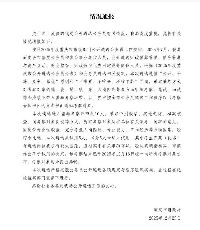 母亲回应儿子公务员遴选成绩第一落选【重庆官方通报公务员遴选第一落选】重庆市财政局发布公务员遴选情况通报如果《2025年度重庆市公开遴选公务员公告》中确实明确本次遴选遵循"不唯票,不唯分,不唯年龄"导向,采取差额方式对考察对象的德,能,勤,绩,廉,人岗匹配等各方面组织考察,笔试,面试综合成绩不带入差额考察环节,那这位考生母亲的做法就是害了孩子。因为其子已有事业编制,身处体制内更应该按照“契约”来。