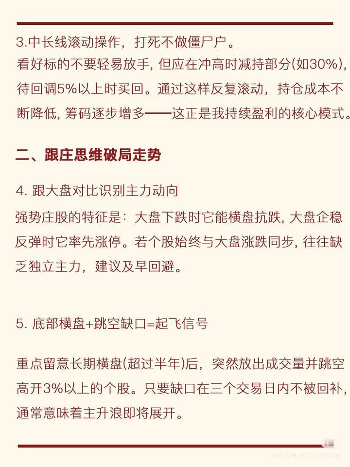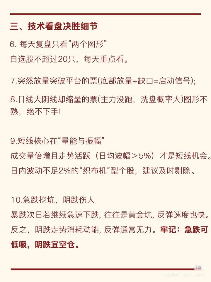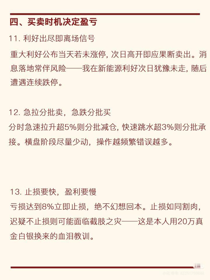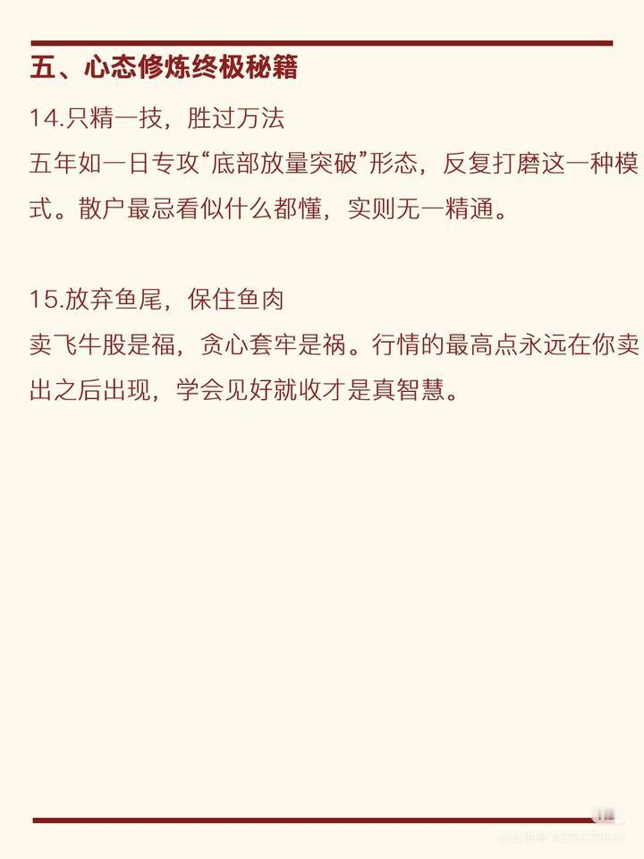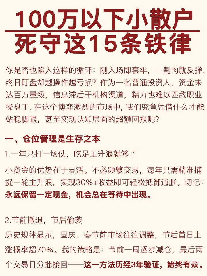 100万以下小散户的投资,总结了15条实用铁律。 普通小散困境:刚入场易套牢、割肉就反弹、盯盘越操作越亏,因资金量小、信息滞后、精力有限,需靠策略立足。 一、仓位管理是生存之本:①一年只打一场仗,精准捕捉一轮主升浪获30%收益即可抵通胀,务必留现金等机会;②利用节前节后规律,国庆、春节前市场常调整,节后首日上涨概率超70%,节前一周逐步减仓,最后两日分批接回,经验证3年有效。 二、跟庄与中长线技巧:③中长线滚动操作,看好标的冲高时减持约30%,回调5%以上买回,降成本增筹码;④跟庄需对比大盘,强势庄股大盘跌时抗跌、企稳率先涨停,同步大盘则无主力;⑤底部横盘超半年后放量跳空高开3%以上,缺口三日内未补,主升浪或来临。 三、技术看盘细节:⑥每天复盘只看不超过20只自选股的“两个图形”;⑦底部放量加缺口突破平台的票是启动信号;⑧日线大阴线却缩量的票多为主力洗盘,不熟悉图形不下手;⑨短线核心是量能倍增且日均波幅>5%,波动不足2%的“织布机”型个股及时剔除;⑩急跌(次日仍急跌)是黄金坑可低吸,阴跌消耗动能宜空仓。 四、买卖时机把控:⑪重大利好当日未涨停,次日高开果断卖,勿像作者因犹豫遇新能源利好后连续跌停;⑫分时急拉超5%分批减仓,急跌超3%分批承接,横盘少动;⑬亏损达8%立即止损,这是用20万真金白银换来的教训。 五、心态修炼:⑭只精“底部放量突破”一技,忌样样懂却无一精通;⑮放弃鱼尾保鱼肉,卖飞牛股是福,贪心套牢是祸,学会见好就收。