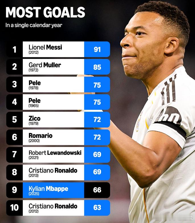 据媒体GOAL统计,皇马前锋姆巴佩在2025自然年俱乐部+国家队各项赛事共打入66粒进球,这数据已经跻身历史前十榜单&暂列现役球员榜单第四。