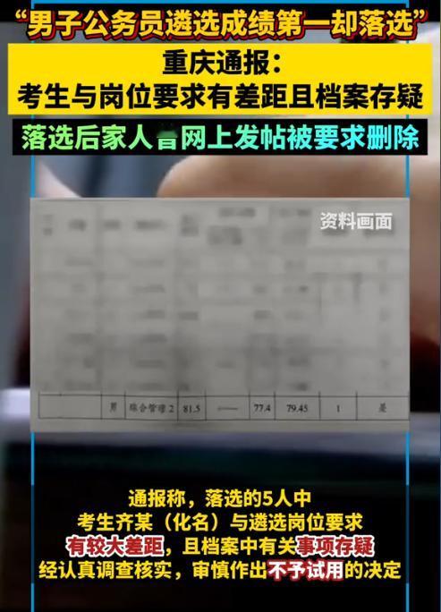 重庆,一33岁硕士学历男子参加财政部门的综合管理岗位考试,笔试和面试成绩均为第一,且顺利通过体检。谁曾想,在拟试用人员名单中却没有男子,反倒是第二名和第三名的考生入选了。财政部门给出的回复是:男子的原单位没有打满分。(来源:第一财经) 今年33岁的齐先生一直是家里的骄傲,本科读的土木工程造价,后来考了重庆的一所大学的硕士学位。 2016年毕业后,齐先生以成绩第一的名次,考上一家参公事业单位。因为其工作能力强,没几年就当上了管理站的副站长。 2025年7月,人社局发了遴选公告,财政部门的综合管理岗位需要招2人,专业要对口土木工程类以及硕士学位,且有2年以上基层工作经历。 齐先生一看自己的条件非常符合,于是就报名参加了。 9月6日的笔试中,齐先生以81.5分的成绩拿了第一名。 10月18日的面试中,又以77.4分,综合成绩79.45分,拿下了第一名。 面试过后,齐先生又去进行了体检,也过关了。 就当齐先生以为一切都稳的时候,在12月16日公示拟录用名单中,却没有齐先生的名字,反而综合成绩差他0.45分的第二名和差他0.85的第三名的并录用了。 对于这个结果,齐先生和家人肯定是不服的,他们将这种不公平待遇发到了网上,想要讨一个说法。谁知消息刚发到网上,就被要求删除。 12月18日,财政部门的工作人员对于齐先生各项成绩第一却未予录用的情况作出了解释,称齐先生的档案存在问题。 原来,齐先生的原单位领导并没有给齐先生的平时表现打满分,而其他入选者都是满分,所以齐先生没有技术职称加分,这与从事的工作和遴选岗位并不匹配。 但这个解释却让齐先生及家人无法接受,齐先生认为自己不是专业技术人员,行政岗位本来就不需要评职称,其质疑既然“不匹配”,那为何报名时能过审。 齐先生还表示,自己多才多艺,在单位主持过大型节目,歌唱比赛也获过奖,人缘也好,此前领导和同事的评价都很高,怎么就有问题了? 对于齐先生的遭遇,有不少网友觉得不合理,报名时符合条件,考察时又说不匹配,这不是矛盾吗? 还有网友表示,以前没打满分这个说法太笼统,应该公开具体评分标准,让考生们明明白白的。 但也有网友表示,差额考察的目的就是为了淘汰高分低能,既然原单位未给打满分,言外之意就是该考生人际关系处理较差,难以融入集体,这种人又如何能进财政部门? 根据《公务员公开遴选办法》第16条规定,考察采取个别谈话、实地走访、同考察对象面谈等方法,听取考察对象所在单位有关领导、同事等的意见,根据需要可以进行专项调查。 第17条规定,遴选机关根据考察情况和职位要求,按照干部管理权限和人岗相适原则,集体讨论择优确定拟任职人员。 由此可见,对于公务员的遴选,原单位领导和同事的意见是很重要的。 齐先生未拿到满分,而第二和第三名却拿到了满分,这也说明了在工作中,齐先生还有做得不到位的地方。 而且齐先生和第二、第三名相差零点几分,悬殊并不是很大,而作为公务员岗位,这同事和领导关系的相处方式十分重要,所以齐先生被刷下来也是情理之中的事。 当然,齐先生有权提出异议。 《公务员公开遴选办法》第22条规定,考生对遴选结果有异议的,可以向遴选机关提出复核申请,或者向同级公务员主管部门提出申诉。 也就是说,齐先生是有救济途径的。可齐先生却把此事放到网上,质疑财政部门的遴选不公正,这会导致财政部门需要给社会一个合理合法的解释,会浪费了不少精力。 这齐先生还没有入选就给目标单位带来了麻烦,那想必即便入职了,将来的仕途也不好走。 对此,您怎么看?欢迎留言留言交流。
