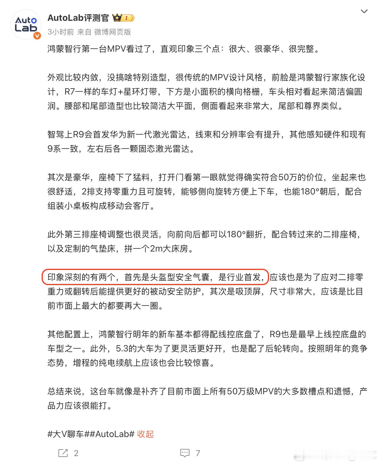 鸿蒙智行首款MPV智界V9曝光智界V9 原来这就是行业首发的「头套式安全气囊」(HAB)?来自延锋,一旦发生事故,有一整套联动防护:先把大角度躺姿的座椅,自动拉回到更安全的直立状态;再由座椅随动机构、座椅集成安全带、头套式安全气囊,以及坐垫气囊等等,组成全套的安全防护。后续其他车企也要跟进了吧。