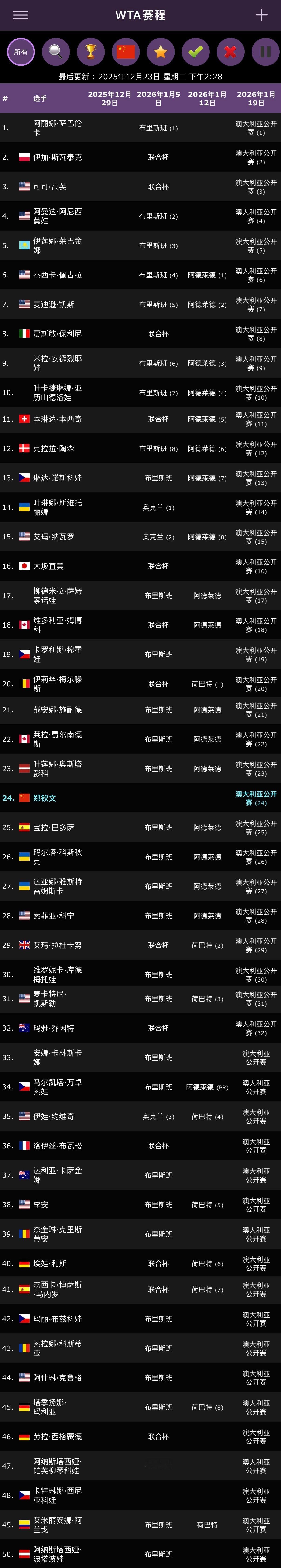 WTA前50球员2026澳洲赛季参赛计划🎾🇦🇺热点解读
