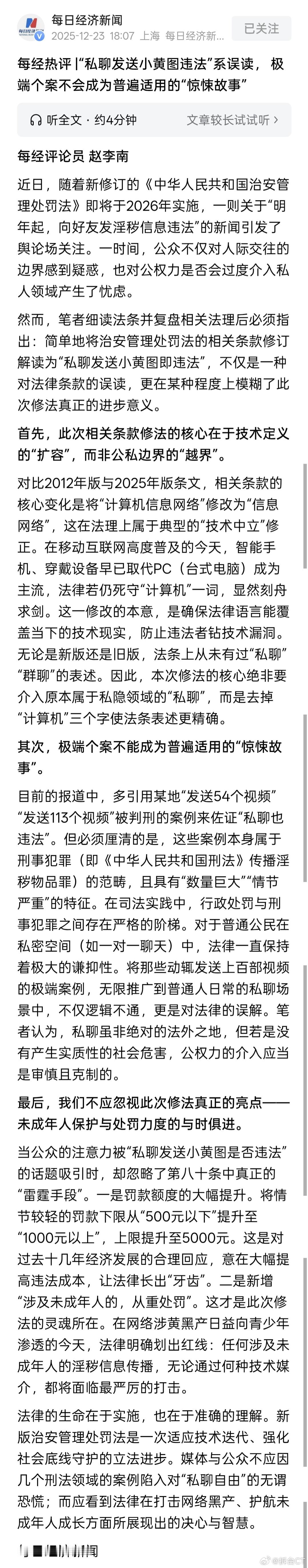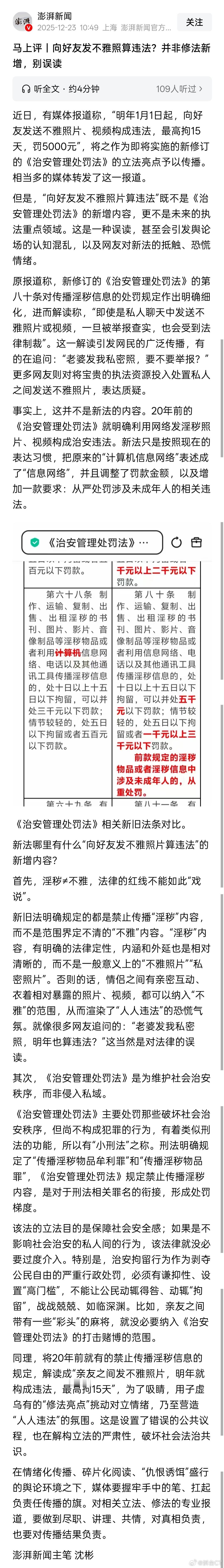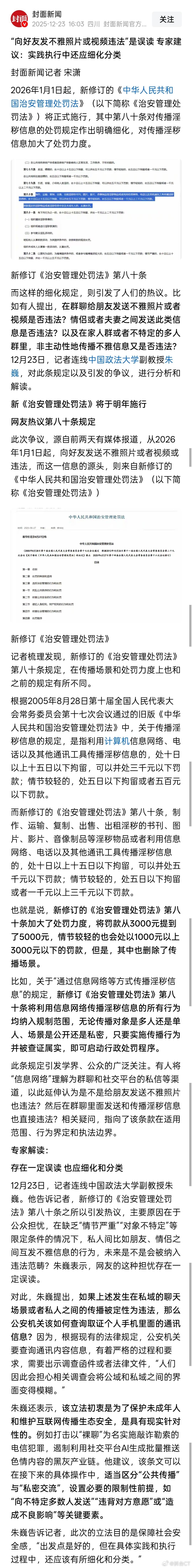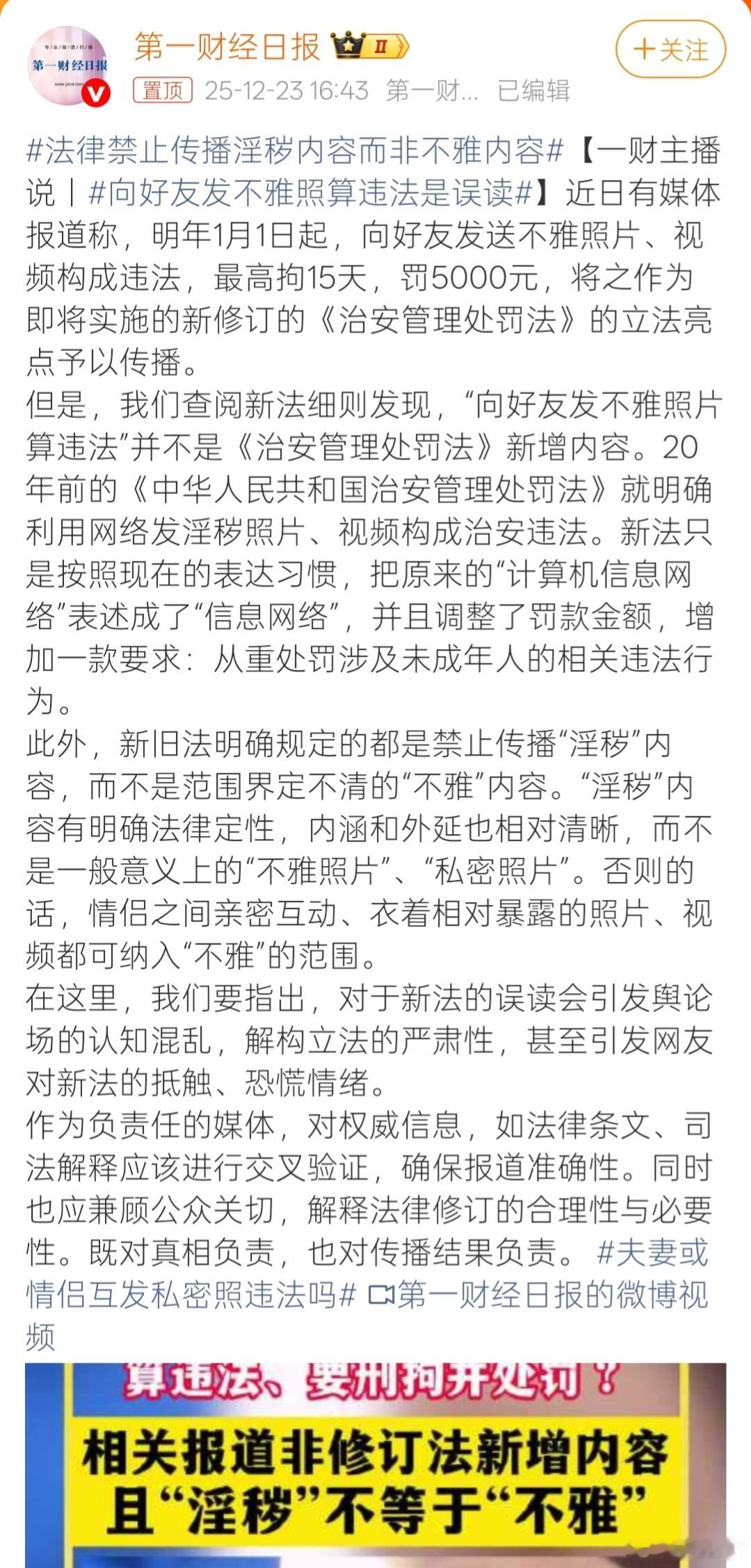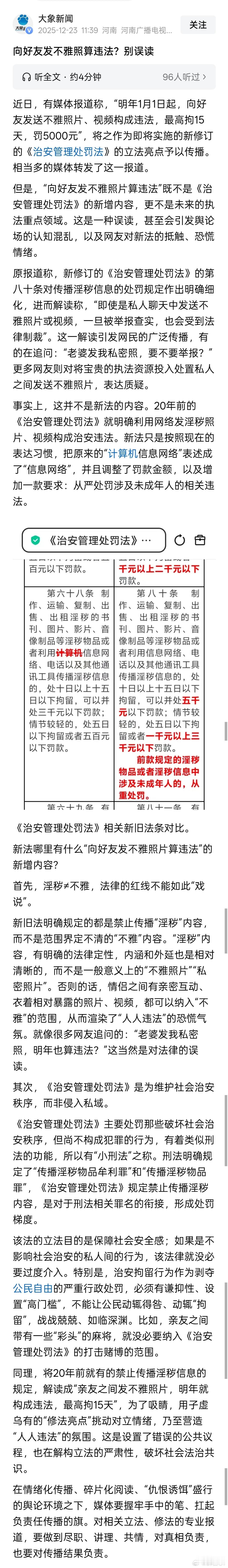 向好友发不雅照算违法是误读南方日报这回算是丢脸丢大了。今天开始,一众媒体同行纷纷刊文澄清,「向好友发送不雅照片算违法系误读」。话说,恁媒体记者现在能不能别老用那个AI辅助写作啊。那玩意很多时候都不准的。在法律这种专业话题上,最好还是咨询对应的行业律师或者法律专家。别素材一丢进AI里,出什么结果都无脑采用。会出大问题的。私聊发不雅内容不再只是社死