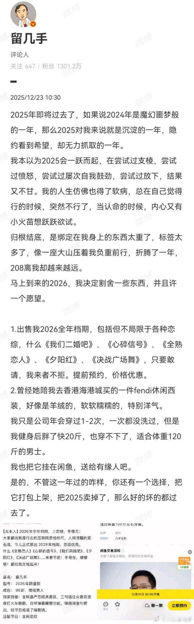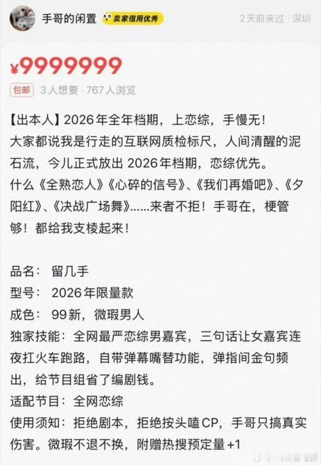 说实话他要是去恋综,节目组就不用担心话题度了很搞笑的是他对自己很有自知之明,闲鱼挂的自己介绍是“微瑕”,他想上恋综时这样的:《我们二婚吧》、《心碎信号》、《全熟恋人》、《夕阳红》、《决战广场舞》留几手挂明年档期喊话想上恋综