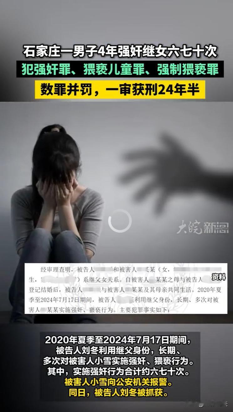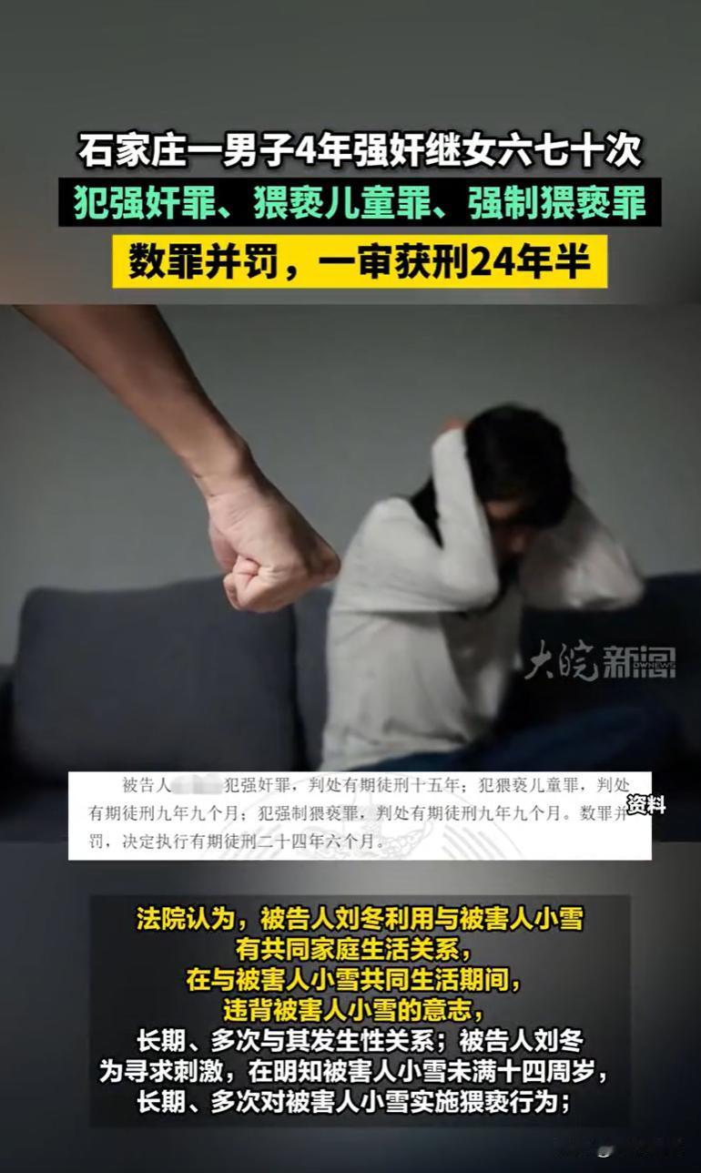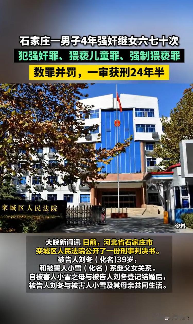 河北石家庄,一女子离异,膝下有一个13岁女儿,为了找个依靠,选择和一39岁男子再婚。不料,男子自继女十岁起,便开始伸出魔爪,利用独处机会,以“如果告诉你妈,我就不要她了,让你回老家”相威胁,强行与她发生关 系。令人发指的是,这样的侵害,在四年间重复了六七十次。女孩在恐惧中沉默长大,直至意识到这一切是违法犯罪,才鼓起勇气报警。法律最终撕开了男子这张恶魔面具下的“父亲”伪装,因其行为极度恶劣且背弃监护职责,法院以强 奸、猥 亵儿童等数罪并罚,对其判处严厉处罚。 小雪出生于2009年,在她约两周半大时,母亲与刘冬登记结婚,组成了新的家庭。 婚后,小雪母亲与刘冬共同生育了一女一儿,加上小雪,这个五口之家在外人看来充满温馨。 刘冬作为继父,与小雪及其母亲共同生活,日常中他对小雪表现“挺好”,甚至让周围人觉得他尽责可靠。 小雪母亲提到,她从未见过刘冬有不轨行为,家人也未曾提及任何异常。 然而,这平静的表象下,却暗藏着可怕的阴影。 2020年夏季,当小雪还是个10岁左右的孩子时,刘冬的魔爪首次伸向了她。 刘冬利用继父身份和共同生活的便利,在某次单独相处时,违背小雪的意志,第一次强行与其发生了关 系。 小雪在事后陈述中回忆,她曾反抗过,但作为一个年幼的孩子,力量悬殊使她无法成功。 更可怕的是,刘冬威胁她:如果告诉任何人,他就会“休了”小雪母亲,让她回老家“自生自灭”。 小雪害怕家庭破碎,害怕失去母亲的依靠,更害怕被抛弃。 于是,小雪选择了沉默,而这沉默,成为了刘冬持续作恶的“通行证”。 从2020年夏季到2024年7月17日,整整四年时间里,刘冬对小雪的侵害从未停止,合计约六七十次。 这个数字触目惊心,平均下来,几乎每月都会发生一至两次。 同时,刘冬还多次对小雪进行wei亵,包括强制 行为,以满足其畸形的欲望。 这些行为发生在家中或其他隐蔽场所,由于小雪母亲的疏忽或刘冬的刻意规避,一直未被察觉。 小雪不敢声张,因为刘冬的威胁如影随形,她试图逃避,但共同生活让她无处可躲,她甚至自责,以为是自己做错了什么。 随着小雪进入青春期,她的法律意识和勇气逐渐增强,她开始明白,刘冬的行为不仅是错误,更是严重的犯罪。 2024年7月17日,小雪终于鼓起勇气,向公安机关报案。 同日,公安机关迅速行动,将刘冬抓获归案。 刘冬到案后供认不讳,承认了侵害事实,但其动机仍显得荒谬,他提出“小雪不是亲生”和“认为不会报警”的说辞。 很快,检察院对刘冬以强J罪、wei亵 儿童罪、强制wei亵罪提起公诉。 法院会如何判决呢? 《刑法》第二百三十六条,强J罪指违背妇女意志,使用暴力、胁迫或者其他手段,强行与妇女发生关 系的行为。对于奸 淫不满十四周岁的幼女,以强J论,并从重处罚。 法院指出,小雪在犯罪期间部分时间未满十四周岁,无论小雪是否同意,由于她未成年,法律给予特殊保护。刘冬长期、多次违背小雪意志发生关 系,完全符合强J罪的构成要件。 同时,《刑法》第二百三十七条规定,wei亵儿童的,处五年以下有期徒刑;情节恶劣的,处五年以上有期徒刑。 法院进一步指出,wei亵儿童罪针对未满十四周岁的未成年人,不要求使用强制手段。 本案中,刘冬对小雪实施wei亵行为时,小雪未满十四周岁,法院依据小雪的陈述和刘冬的供述,认定刘冬为寻求刺激,长期、多次对被害人小雪实施侵害行为,构成wei亵儿童罪。 此外,《刑法》第二百三十七条还规定,以暴力、胁迫或者其他方法强制wei亵他人或者侮辱妇女的,构成强制wei亵罪。 本案中,刘冬以威胁休掉小雪母亲等手段对小雪进行wei亵,这属于胁迫方法。 法院指出,刘冬长期、多次以胁迫等方法强制wei亵被害人小雪,情节恶劣,构成强制wei亵罪。 《刑法》第六十九条规定,判决宣告以前一人犯数罪的,除判处死刑和无期徒刑的以外,应当在总和刑期以下、数刑中最高刑期以上,酌情决定执行的刑期,……总和刑期在三十五年以上的,最高不能超过二十五年。 法院认为,刘冬的行为同时触犯前述三项罪名,每项罪行都有独立的事实支撑,应当数罪并罚。 不过,刘冬虽然到案后如实供述,符合坦白情节,依法可以从宽处罚。 但是,刘冬在四年内实施侵害小雪约六七十次,威胁小雪保持沉默,犯罪持续时间长、频率高,对小雪造成长期身心创伤,情节非常恶劣。 而刘冬作为小雪的继父,且与小雪共同生活多年,具有共同生活关系且事实上负有照顾、保护职责,系对负有特殊责任的人员实施侵害行为,依法应当从重处罚 最终,法院判决刘冬犯有强J罪、wei亵儿童罪、强制wei亵罪三项罪名,数罪并罚,决定执行有期徒刑24年6个月。 对此,您怎么看?