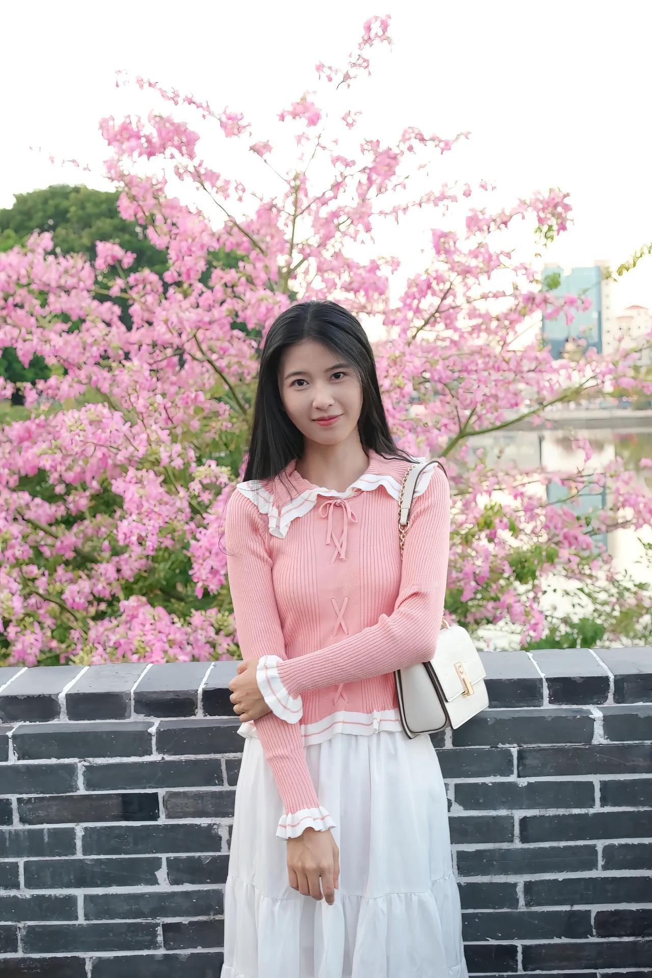 粉衣少女立绿荫,笑语盈盈意自闲。