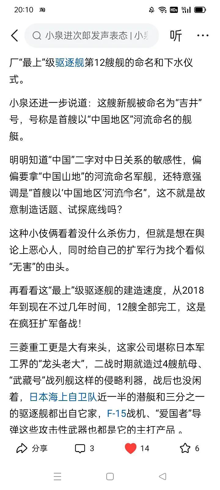 小泉进次郎是高市早苗的最大帮凶 中国可以制裁这两个‘军国主义分子’ 它(小泉进次郎)叫嚣说‘日本绝不会听从中国而收回高市讲话’。 它还说日本应该可以拥有核武器。 它刚参观了停泊在横须贺的美国核潜艇,日本执政的自民党正在谋求拥有核潜艇。 它还宣布日本已经拥有太空作战能力,要打击破坏敌对国家的卫星。 它还向全世界推销日本的护卫舰,据说最近下水的第12艘‘最上’护卫舰竟然极具侵略性地以中国的地名命名为吉井!