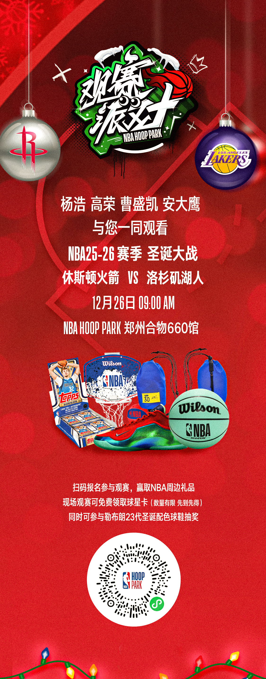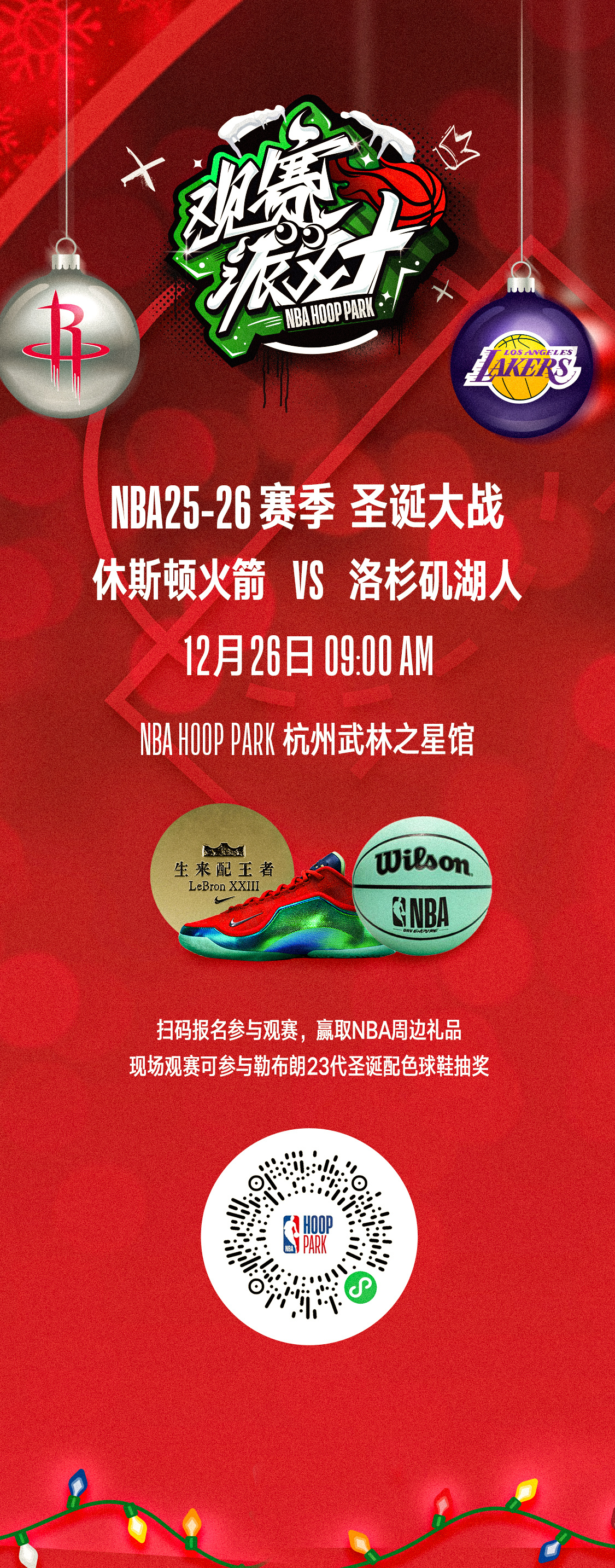 湖人火箭圣诞大战线下免费观赛,更有机会在线下免费抽取勒布朗23代圣诞配色。参与地址:郑州合物660馆、杭州武林之星馆、西安高新馆。