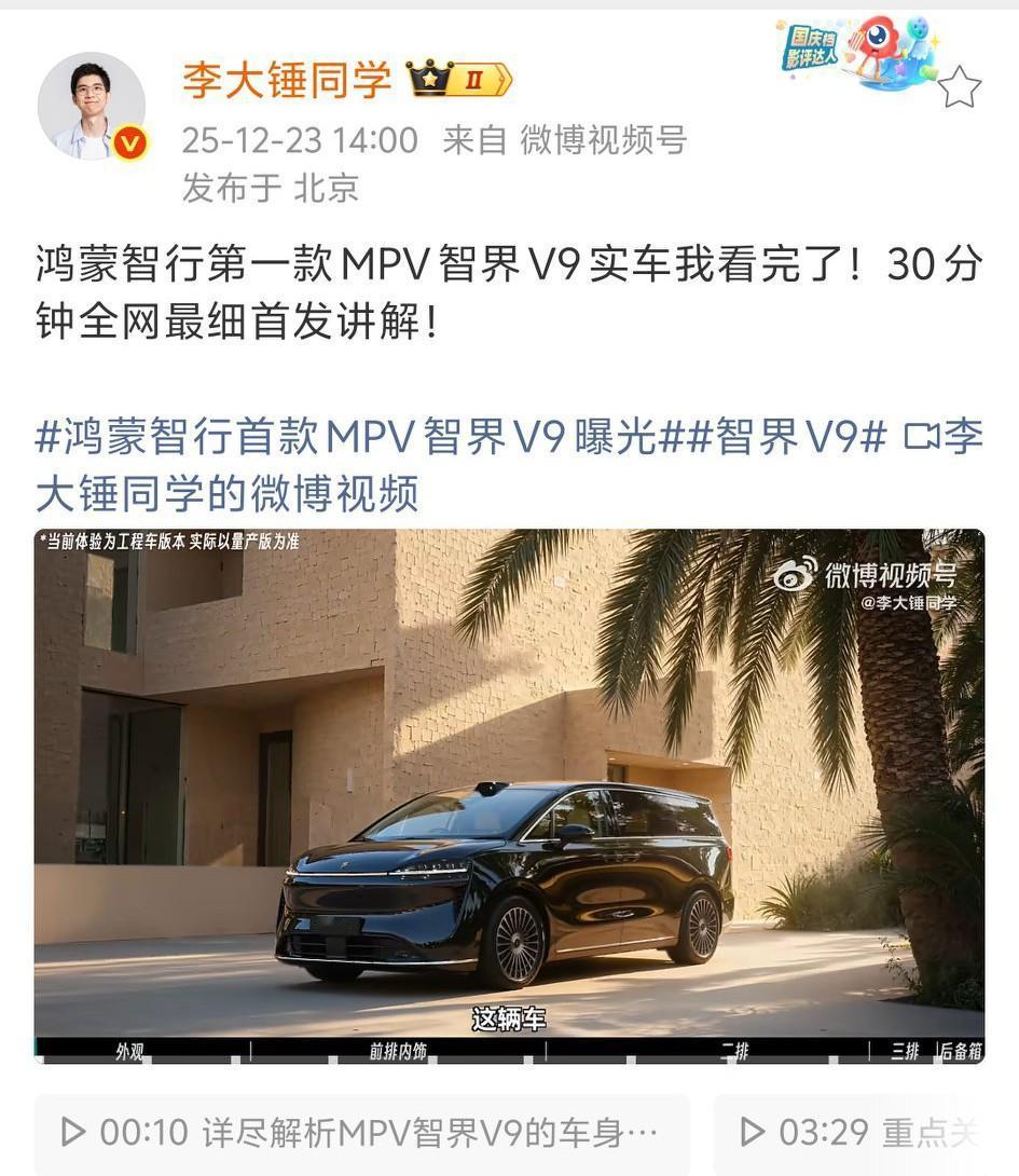 博主李大锤参加完鸿蒙智行举办的智界V9媒体品鉴会,第一时间就发视频“剧透”V9了