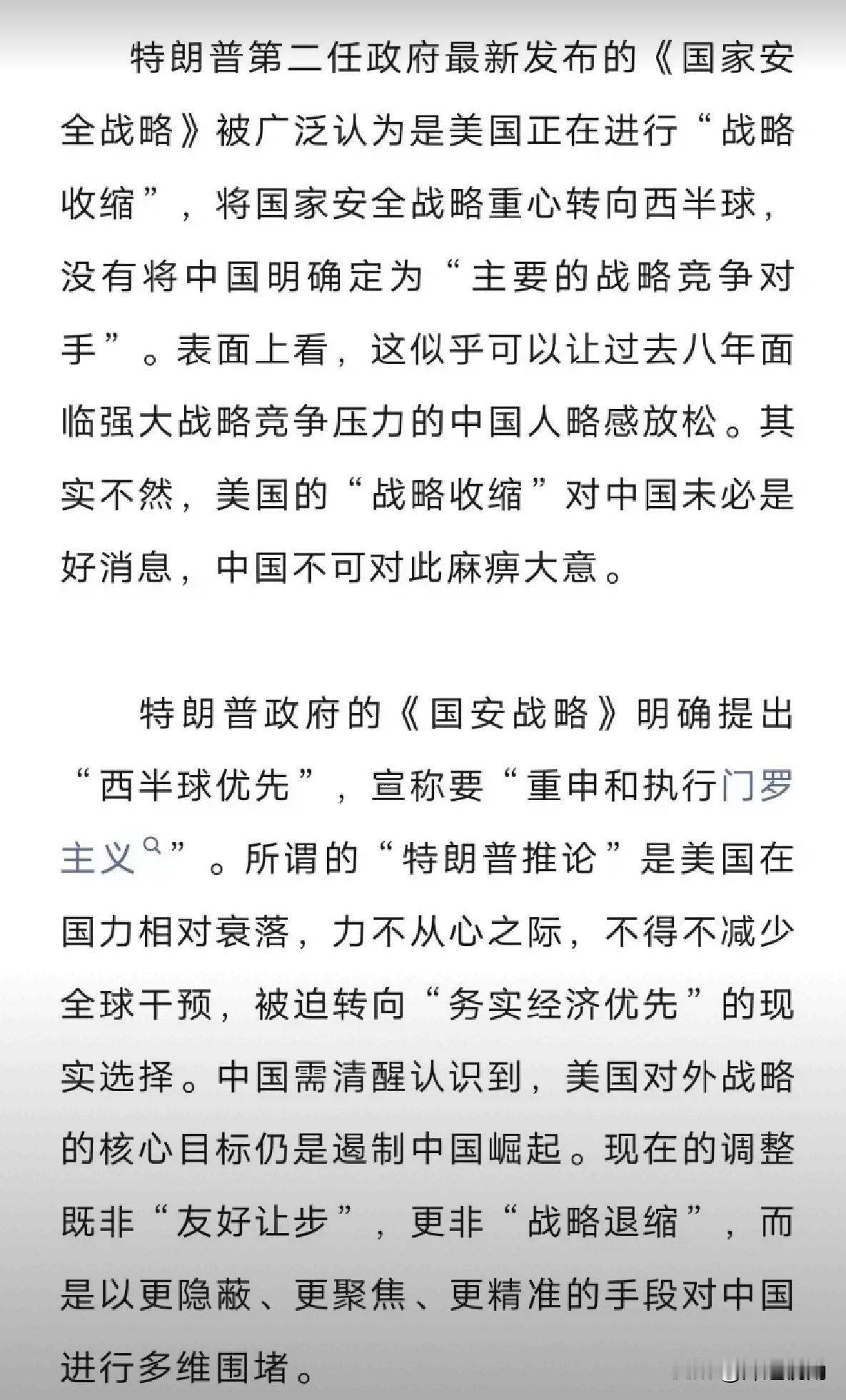 别被美国骗了!特朗普的“战略收缩”,其实是换着法围堵中国。招招精准发力,拉满算计感。 刚看到特朗普第二任政府的《国家安全战略》,好多人说美国开始“战略收缩”,把重心转回西半球,没明着把中国当对手了,好像我们能松口气似的?这想法可太天真了!这根本不是美国服软,而是他们国力跟不上了,换了更阴的招数来针对我们。 说白了,美国现在喊“西半球优先”、重拾门罗主义,就是以前能满世界当“警察”,现在力不从心了,只能先把家门口的西半球攥紧。但这可不是放弃遏制中国,而是从以前的“全面找茬”,变成了“精准使坏”。 你看看他们玩的套路,招招都拉满算计感。 1. 经济上搞精准脱钩:拉着拉美搞产业链,想在芯片、新能源矿产这些关键领域跟咱们切断联系,比之前的贸易战更盯着我们的软肋来; 2. 地缘上搞侧翼捣乱:让拉美国家在台海、南海这些事上帮腔,想分散我们的精力; 3. 规则上偷偷挖坑:联合西半球盟友搞新规则,想把我们排除在国际游戏之外,这软刀子比硬对抗更难防。 不过我们也不用慌,美国这招看着花,其实是国力衰落的无奈之举。我们只要把自己的产业链做硬,继续跟东盟、中东这些朋友搞好合作,再跟拉美国家多做买卖、多交流,打破美国想把西半球变成“反华小圈子”的算盘,他们这招就没用。 说到底,美国从来没放弃过遏制中国崛起,只是换了种打法。我们保持清醒,做好自己的事,就不怕他们耍花样! 你觉得美国这波操作能得逞吗?评论区聊聊你的看法。