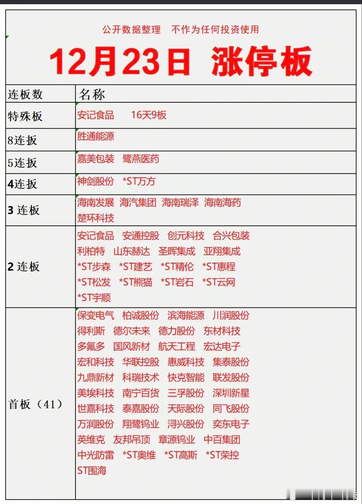 12.23周二 涨停板股票:梯队+高度!涨停68家:跌停15家涨跌比:涨1512 跌385616天9板 安记食品8连板 胜通能源5连板 嘉美包装 鹭燕医药