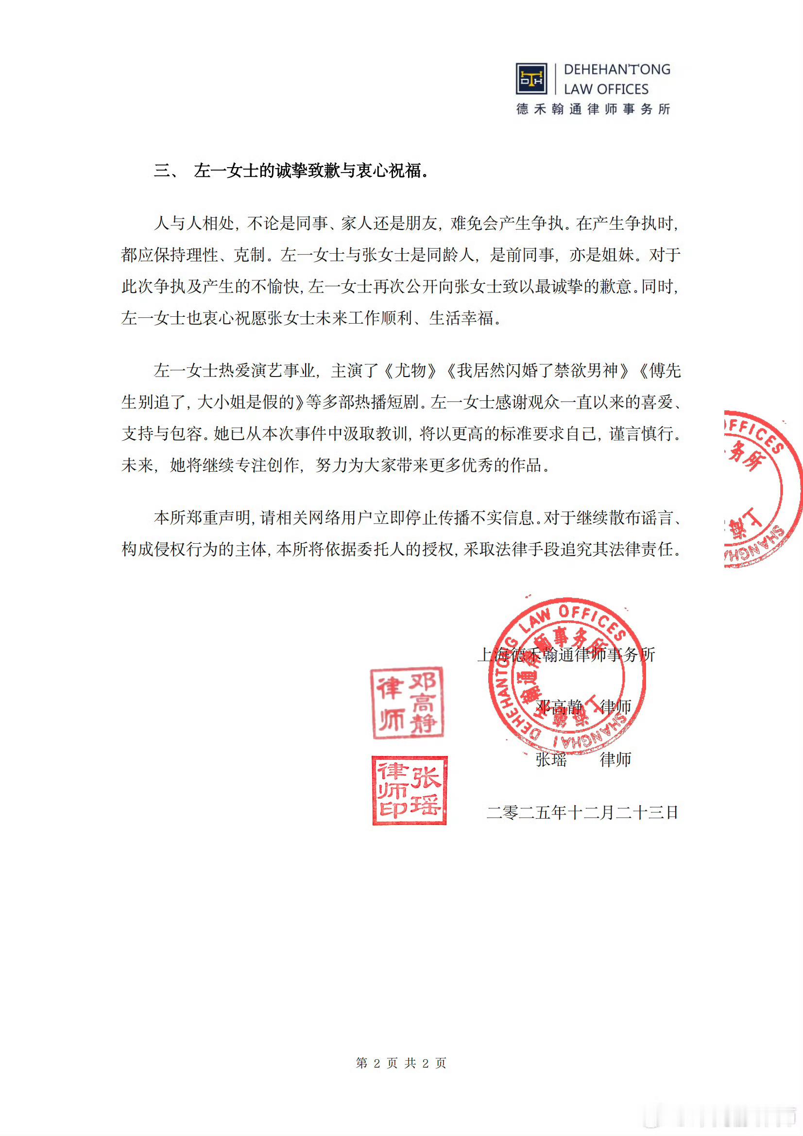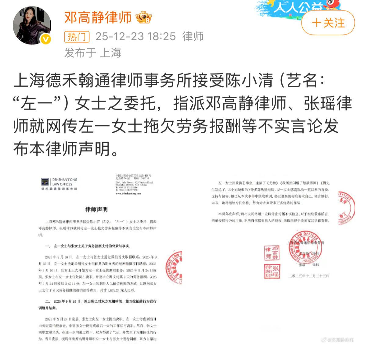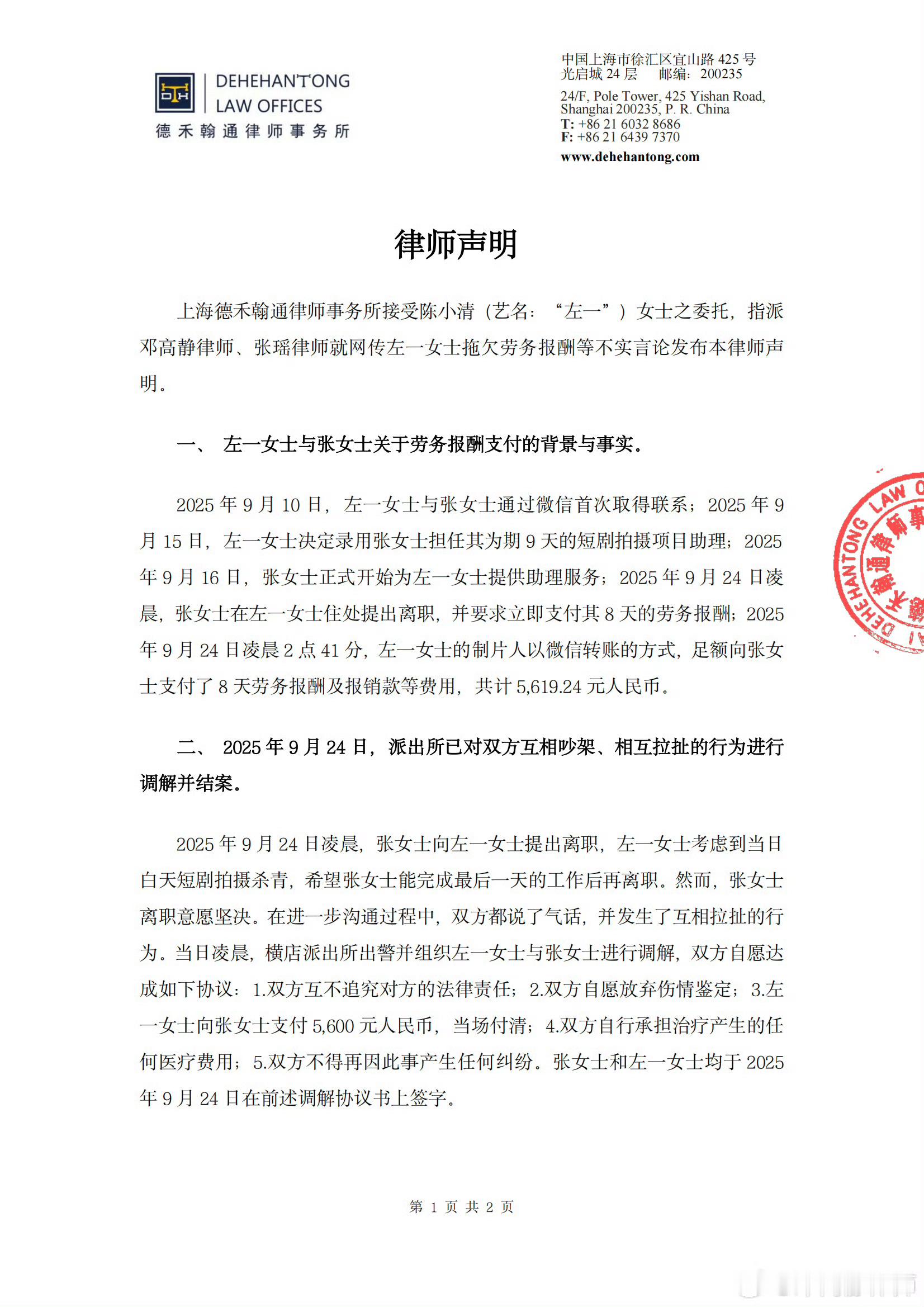 左一方发律师声明回应 23日,据,上海德禾翰通律师事务所接受陈小清(艺名:“左一”)女士之委托,指派邓高静律师、张瑶律师就网传左一女士拖欠劳务报酬等不实言论发布本律师声明。声明部分内容如下:2025年9月24日凌晨,张女士向左一女士提出离职,左一女士考虑到当日白天短剧拍摄杀青,希望张女士能完成最后一天的工作后再离职。然而,张女士离职意愿坚决,在进一步沟通过程中,双方都说了气话,并发生了互相拉扯的行为。当日凌晨,横店派出所出警并组织左一女士与张女士进行调解,双方自愿达成如下协议:1.双方互不追究对方的法律责任;2.双方自愿放弃伤情鉴定;3.左一女士向张女士支付5600元人民币,当场付清;4.双方自行承担治疗产生的任何医疗费用;5.双方不得再因此事产生任何纠纷。张女士和左一女士均于2025年9月24日在前述调解协议书上签字。本所郑重声明,请相关网络用户立即停止传播不实信息,对于继续散布谣言,构成侵权行为的主体,本所将依据委托人的授权,采取法律手段追究其法律责任。此前,短剧演员左一因打助理引发争议,12月21日,左一发文承认打助理一事并向助理道歉。