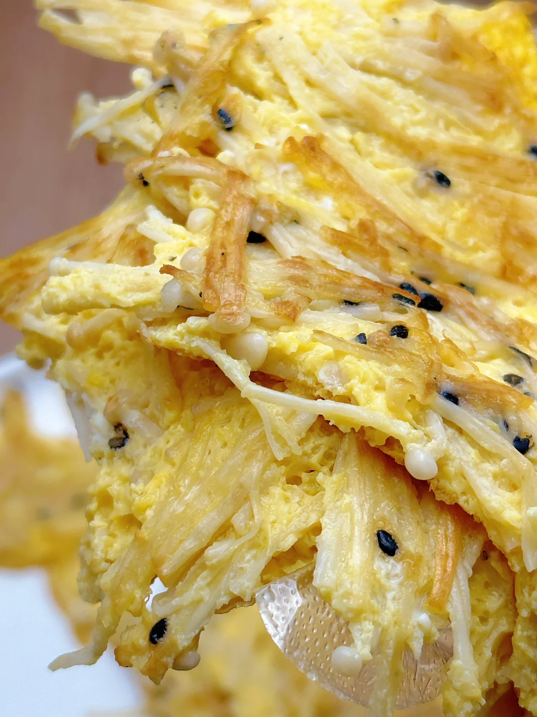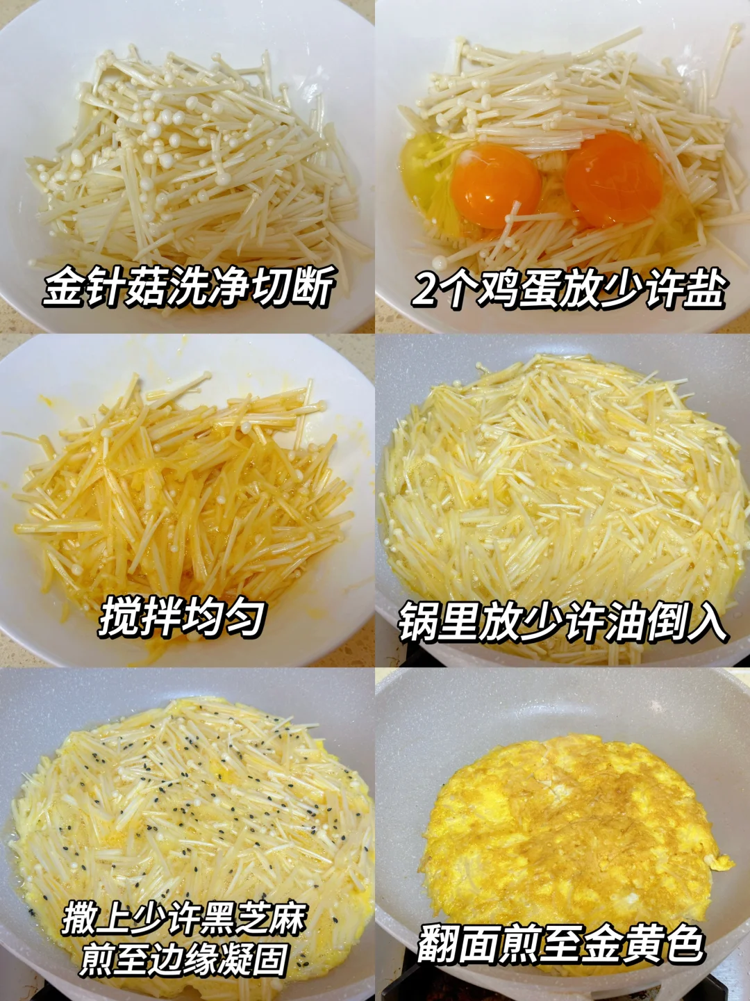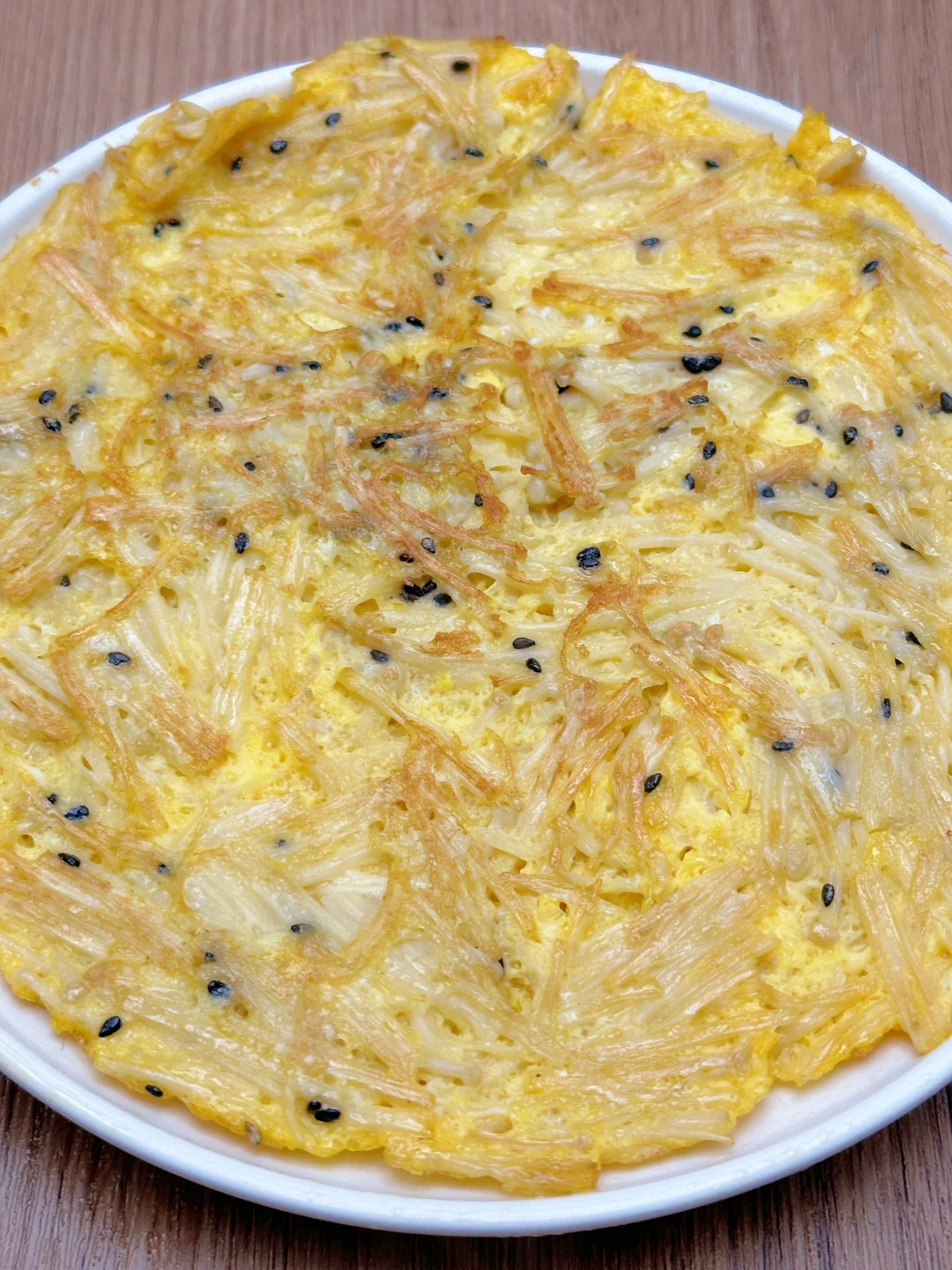 这个金针菇蛋饼,一大盘才100多大卡!! 真的巨巨巨巨巨香!而且低脂低卡~~ 膳食纤维和蛋白质的组合,真的是巨巨巨掉秤组合~ 🥗食材:金针菇、鸡蛋 🥘做法:如图所示 1⃣️金针菇切成小段,打入鸡蛋。放少许盐搅拌均匀 2⃣️平底锅开小火,倒入鸡蛋液,撒上黑芝麻,煎至两面金黄即可~ 姐妹们,快去试试吧~真的很好吃而且很简单,姐们们翻面的时候记得用盘子辅助~