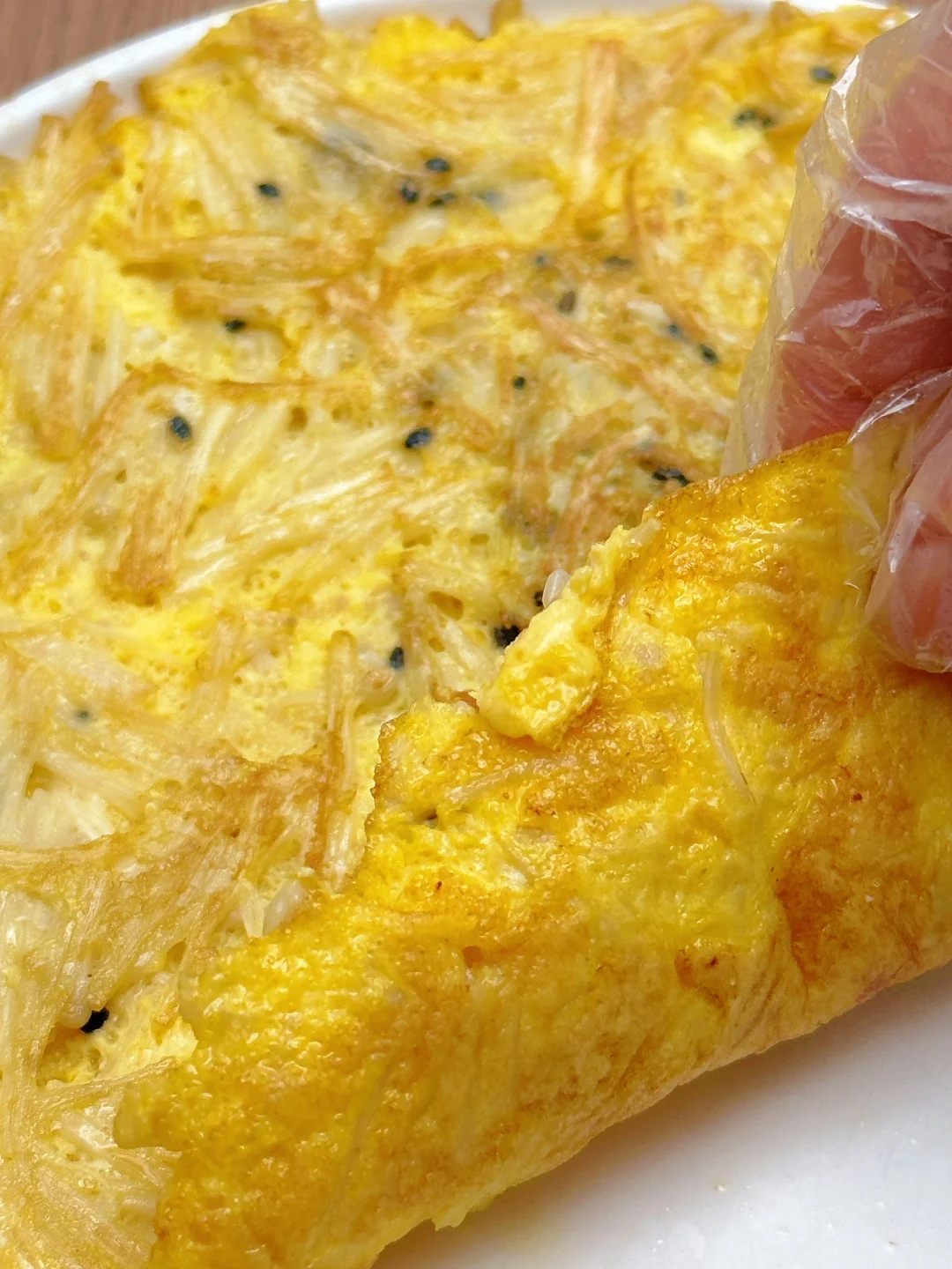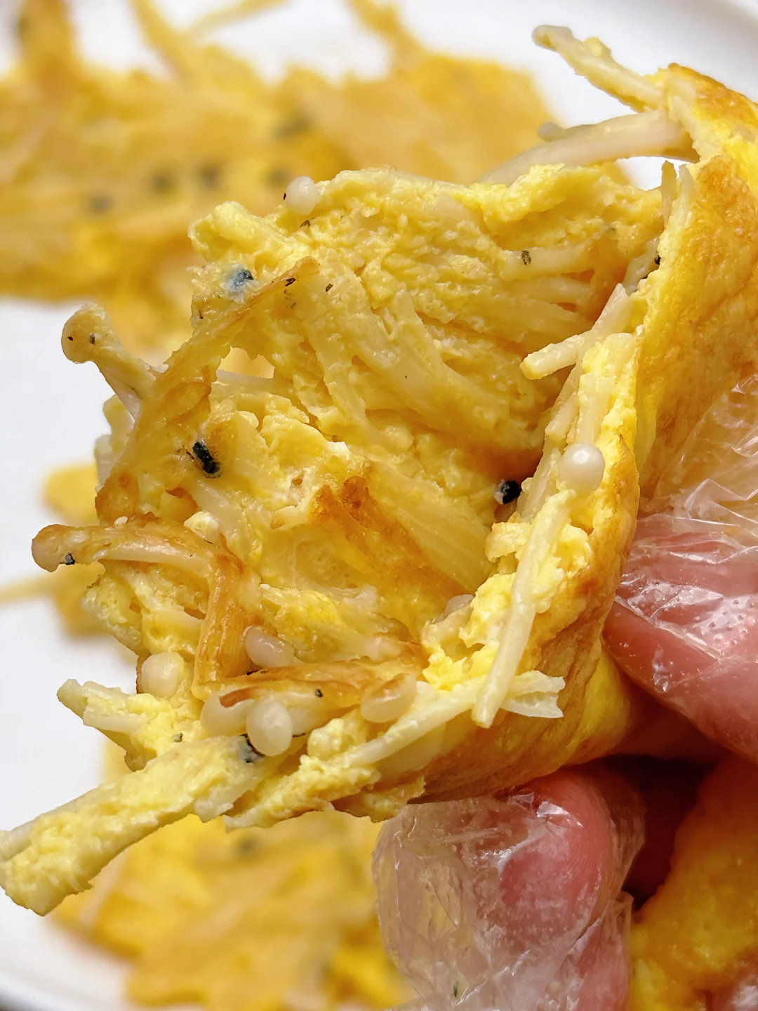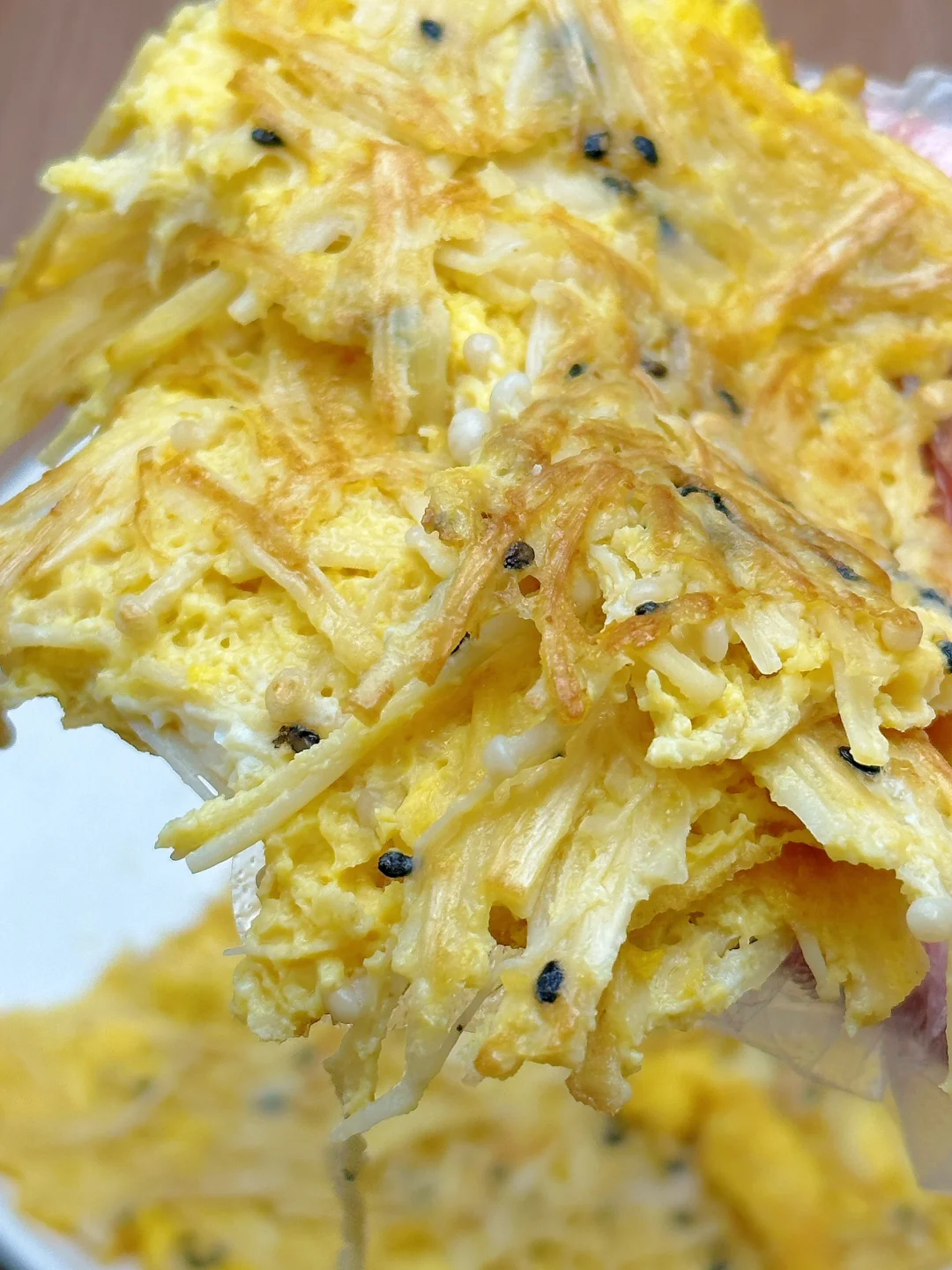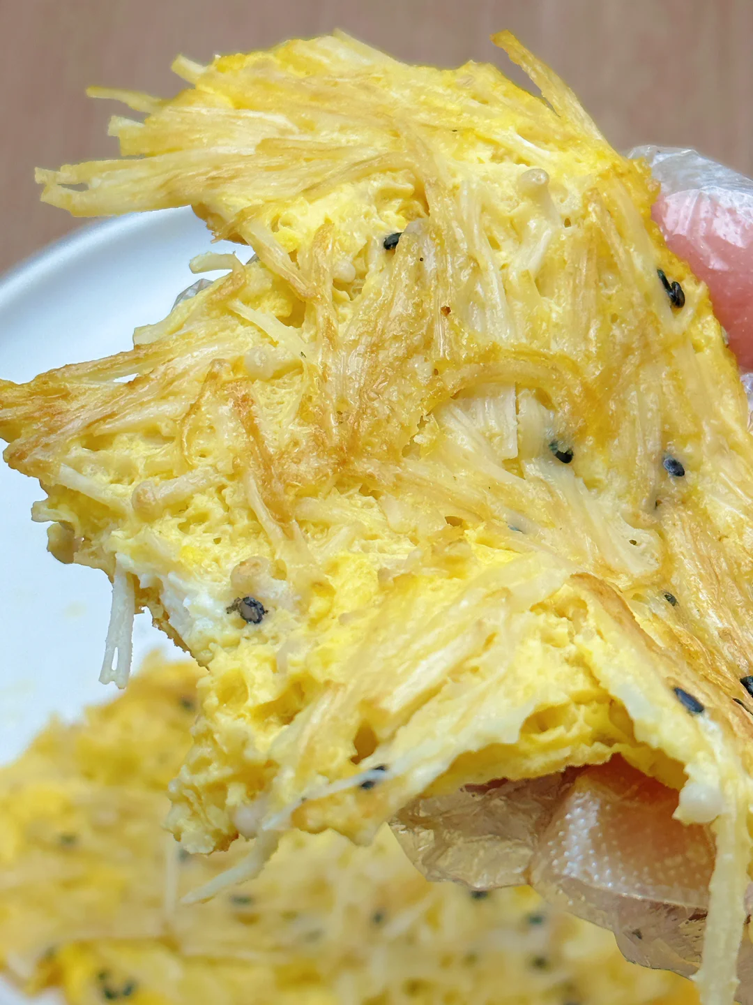 这个金针菇蛋饼,一大盘才100多大卡!! 真的巨巨巨巨巨香!而且低脂低卡~~ 膳食纤维和蛋白质的组合,真的是巨巨巨掉秤组合~ 🥗食材:金针菇、鸡蛋 🥘做法:如图所示 1⃣️金针菇切成小段,打入鸡蛋。放少许盐搅拌均匀 2⃣️平底锅开小火,倒入鸡蛋液,撒上黑芝麻,煎至两面金黄即可~ 姐妹们,快去试试吧~真的很好吃而且很简单,姐们们翻面的时候记得用盘子辅助~