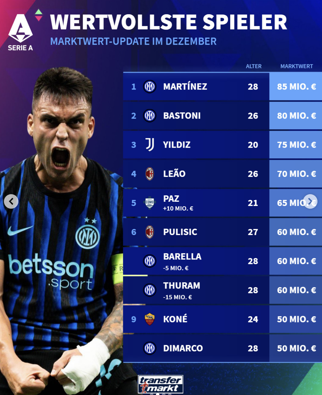 国际米兰的劳塔罗和巴斯托尼分别以8500万和8000万欧排名前二,尤文图斯的伊尔迪兹以7500万排第三。前十榜单中,国米球员占据5席,AC米兰占据2席。