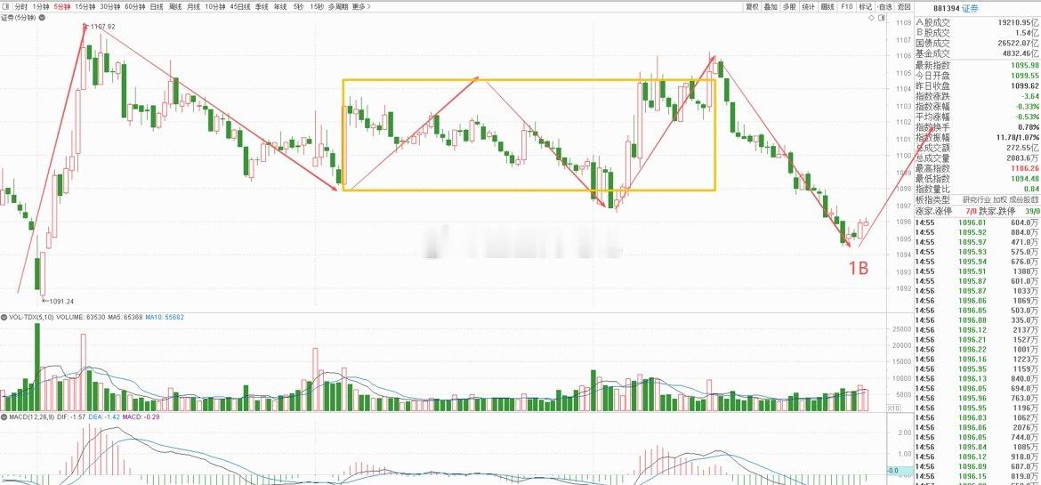 券商板块五分钟级别构建完成了一中枢下跌结构,收盘前出现了一定的背驰,但信号并不强烈,明天就看能否直接开始这笔买点的拉升,最好能摸到中枢上沿附近,这样才有机会完成止跌。一旦明天继续下挫,那将升级为30分钟级别的下跌中枢结构,后面还会再创阶段新低。