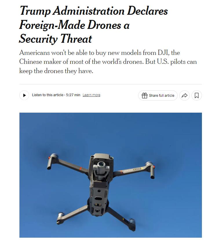 据美媒:美国禁止中国产无人机,引发操作员的愤怒。而推动这一政策与政客的利益有关,包括特朗普的儿子。 在美国近50万名注册无人机驾驶员中,许多人使用大疆设备建立起小型企业。这些无人机承担着各种工作,如为农田喷洒肥料、勘测土地、监控建设项目,以及检查屋顶和公用事业线路等。 “人们对整件事感到不满——极度、无比的愤怒,”维克·莫斯说。他是“无人机倡导联盟”的志愿负责人,该组织代表希望继续购买大疆无人机的飞手。 他指出,政府没有试图禁止美国人使用已拥有的无人机,其中一个原因是那样会妨碍应急工作。全美各地的执法机构都在使用大疆无人机来追踪逃犯、搜寻迷路的徒步者,以及寻找在洪水中被冲走的儿童遗体。 这一决定的伏笔早在一年前就已在国会埋下。当时,《2025财年国防授权法》要求在2025年12月23日前,就大疆或另一家中国无人机制造商道通智能生产的视频监控设备是否构成安全威胁作出评估。相关条款源自纽约州共和党众议员埃莉斯·斯特凡尼克起草的一项法案,她曾誓言要“确保中国无人机被禁止进入美国天空”。 无人机行业的许多人原本预期会对该技术进行一次全面审查,以确定大疆无人机是否含有与中国实体共享信息的秘密后门。然而,该决定似乎仅基于对政府机构已知信息的简单审查。 数月来,大疆一直致函美国官员要求进行严格审计。 “大疆随时准备与你们合作,保持开放和透明,并提供完成全面审查所需信息,”大疆全球政策负责人亚当·威尔士本月在致国防部长皮特·海格塞斯等人的信中写道。 这一决定虽在预料之中,却令全美大多数拥有和操作大疆设备的无人机驾驶员深感失望。 在全美范围内为商业无人机驾驶员提供自由职业机会的FlyGuys公司首席运营官达科达·巴特尔斯表示,他拥有第一代大疆精灵V-1无人机迄今所有的迭代升级版本。如今,他面临无法再获得该公司每年发布的技术升级的前景。 “大疆公司仍将继续创新,并在其他国家提供产品,”巴特尔斯说。“只是我们将无法接触到它们。这很遗憾。” 他表示,美国制造的无人机价格高出四倍,“性能却只有一半。” 但这一宣布却让推动这一政策的美国本土新兴无人机公司欢欣鼓舞。 为公共安全领域制造无人机的西雅图公司BRINC在声明中表示:“这是一个具有历史意义的决定,将改变美国无人机制造商的一切。BRINC及同行已准备好响应号召,重建美国无人机产业。” 另一家希望填补大疆空缺的公司是Skydio,这家美国无人机企业聘请了斯特凡尼克的前国家安全顾问乔·巴特利特担任其联邦政策主管。巴特利特现任商务部工业与安全局助理副部长,该部门参与了这一关乎大疆命运的决策。Skydio拒绝置评。 总部位于佛罗里达的无人机零部件制造商Unusual Machines同样有望从这一决定中受益。该公司首席执行官艾伦·埃文斯周一在致《纽约时报》的声明中表示,这一决定意味着本土制造商“既拥有机遇,也肩负起尽快打造并交付世界级产品的责任”。小唐纳德·特朗普是该公司顾问委员会成员。 联邦通信委员会的声明明确指出,这一决定不影响无人机飞手继续使用已拥有的无人机或此前获批的型号。