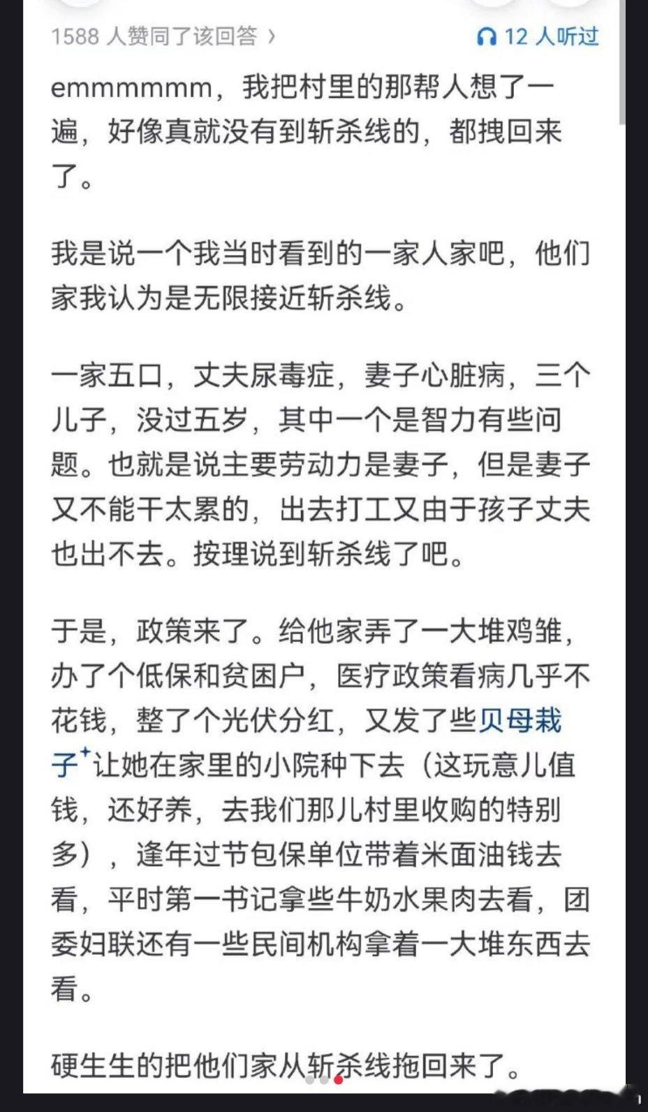 中国没有斩杀线的原因:无敌的锁血机制。一家五口,丈夫尿毒症,妻子心脏病,三个儿子,没过五岁,妻子不能干太累,丈夫不能出去打工。各种政策和扶贫,硬生生把他们家从斩杀线拖回来了。中国锁血机制热点现场