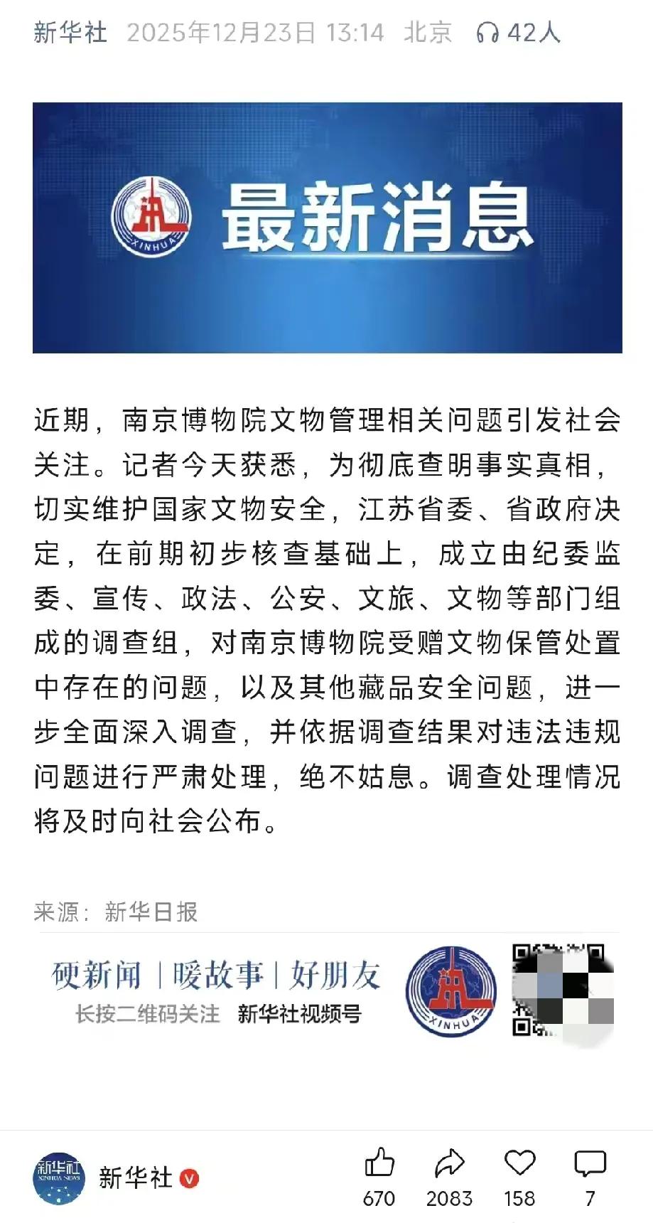 正式官宣:相关部门已经正式介入调查南京博物院事件,这说明大家的呼吁和关注已经取得了初步成果。 官方正式介入,这下我们可以松一口气了,相信此事不弄个清清楚楚,明明白白是不会罢休的。 一定要弄清楚所有文物的去向,一定要搞清楚所有参与此事人的责任,并且依法追究。 接下来大家就静下心来等待相关部门的调查结果,不要再编一些补风捉影的消息来扰乱相关部门的工作,我们一定要相信政府,此事他们一定会查的清清楚楚,给大家一个明明白白的交待。