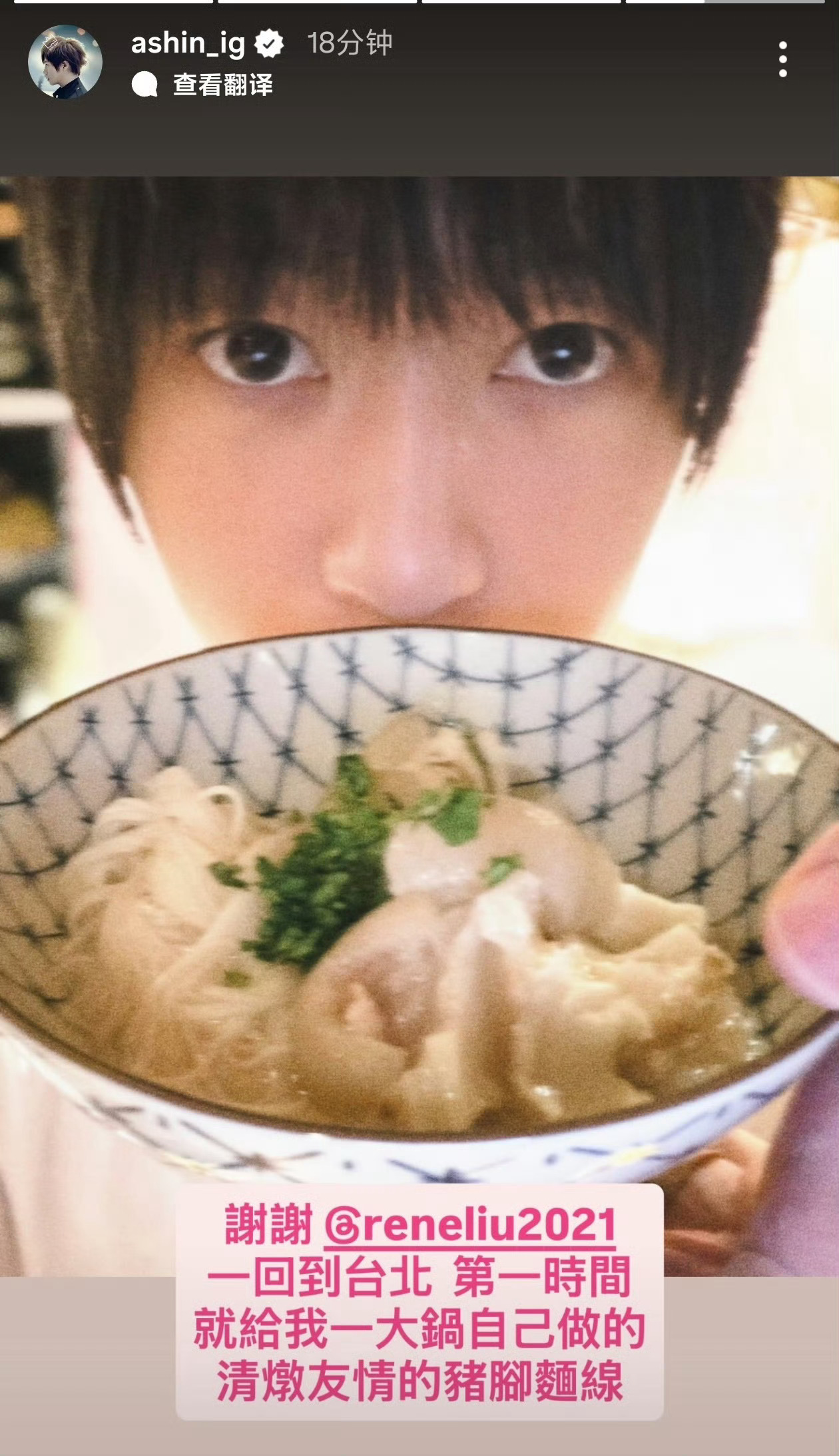 刘若英给阿信做猪脚面线阿信:谢谢刘若英,一回到台北,第一时间就给我一大锅自己做的清炖友情的猪脚面线🍜。