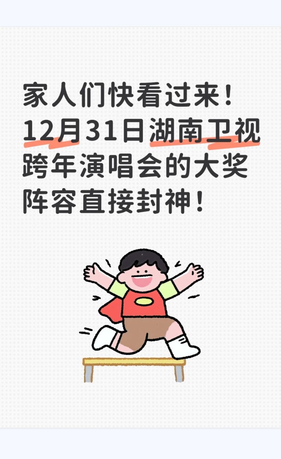 12月31日湖南卫视跨年演唱会的大奖阵容直接封神!8.99万起的埃安UT Super国民好车配京东鲜花,500公里长续航+99秒换电超实用,还有能拟人交互、灵活跳舞的智元灵犀X2机器人,科技感拉满~ 666份1号会员店尊拿卡承包全年好鸡蛋,6份周大福黄金婚嫁套装自带贵气,2000份七鲜私厨宿迁黄狗猪头肉解馋过瘾。更有“2026样样红”终极大奖,奥佳华按摩椅+TCL 98英寸巨幕电视+智元远征A2机器人,还有2026元京东超市卡等豪礼!上某东APP搜“跨晚”就能参与互动,瓜分千万好礼和10亿红包,幸运儿说不定就是你~