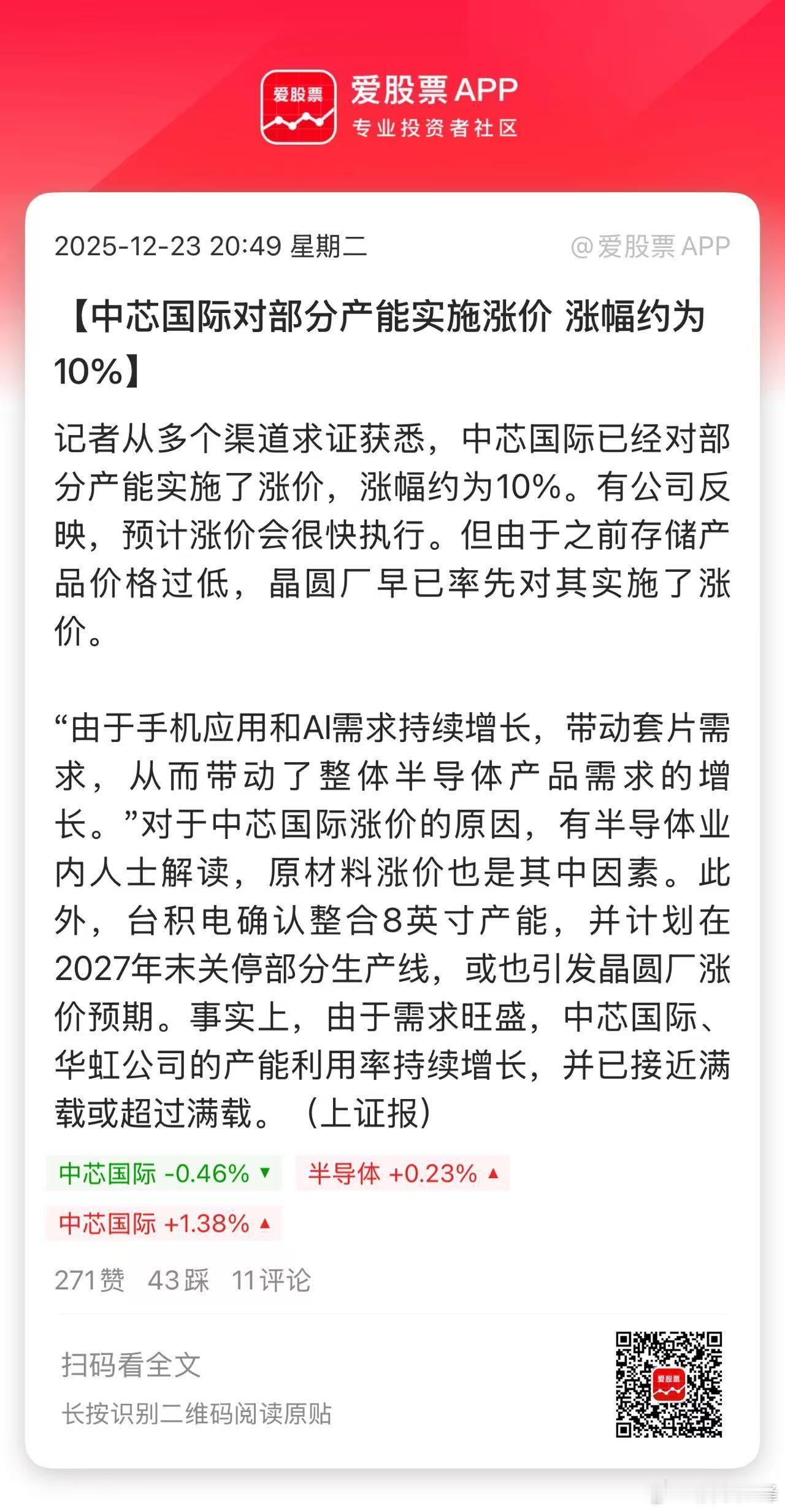 中芯国际宣布对部分产能涨价10%,前两天有这个小作文,今天算是正式落地了!涨价原因是今年手机应用+AI需求大爆发,目前主要晶圆代工厂产能高度紧张,中芯第三季度产能利用率达95.8%,华虹公司更是高达109.5%。台积电都涨价好几轮了,中芯必然会该跟进的。今年内存暴涨,明年看来芯片半导体也要起飞,手机等消费电子涨价看来已经是大势所趋!不知道国内各大厂怎么解决?要是涨价太多,消费者真换不起手机了。这个主要利好半导体芯片,还有光刻胶、光刻机等设备材料方向。明天科技线要继续奏乐继续嗨了!(爱股君)