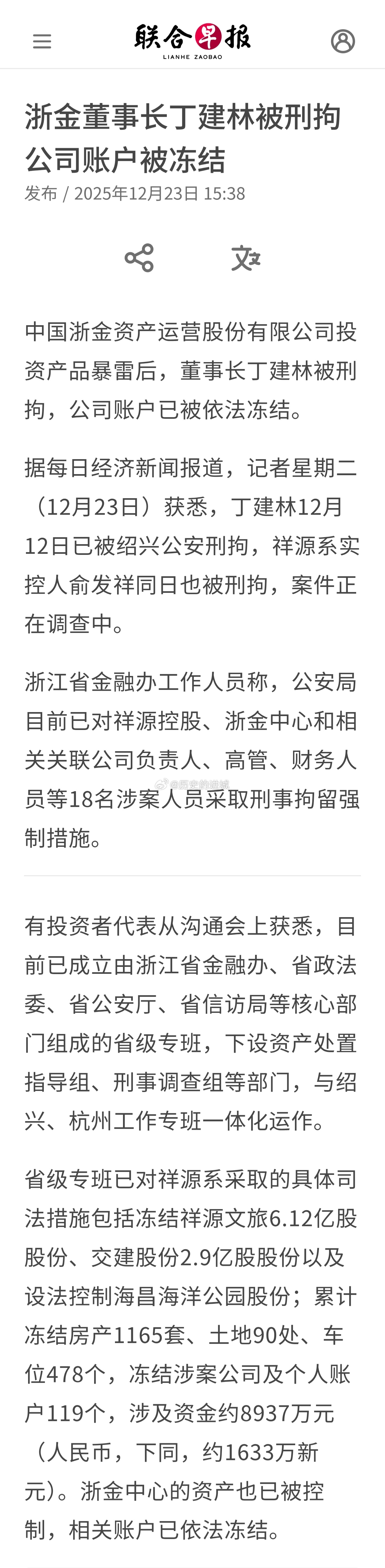浙金资产运营股份有限公司投资产品暴雷后,董事长丁建林被刑拘,公司账户已被依法冻结。据每日经济新闻报道,记者星期二(12月23日)获悉,丁建林12月12日已被绍兴公安刑拘,祥源系实控人俞发祥同日也被刑拘,案件正在调查中。浙江省金融办工作人员称,公安局目前已对祥源控股、浙金中心和相关关联公司负责人、高管、财务人员等18名涉案人员采取刑事拘留强制措施。